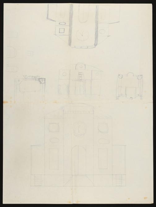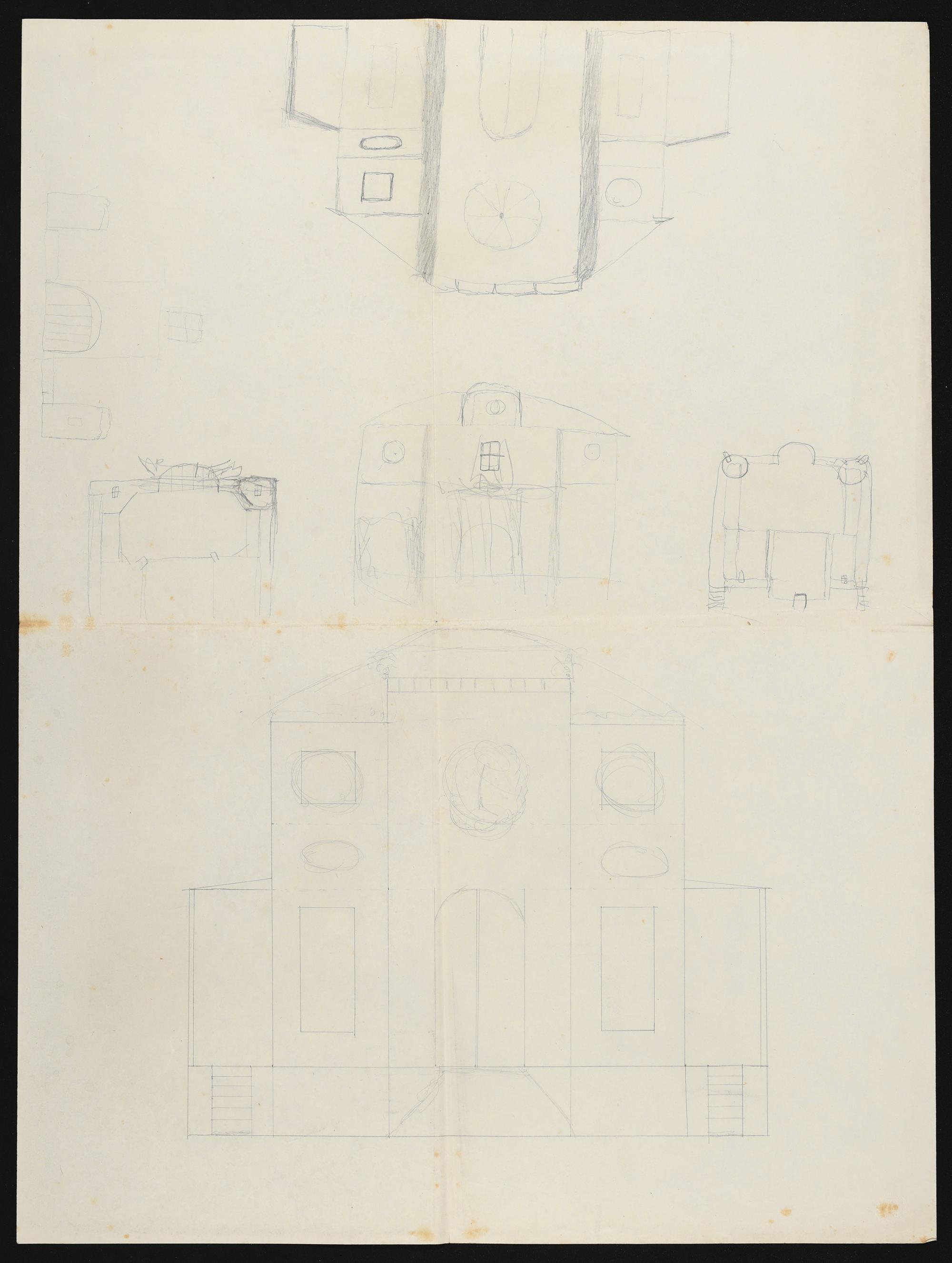 eigenhändige Skizzen, Grundrisse und Aufrisse von Haus Wahnfried von Richard Wagner, links: Querschnittsvariante und ein Querschnitt zwischen zwei Erdgeschossvarianten, rechts: Eingangsfassade