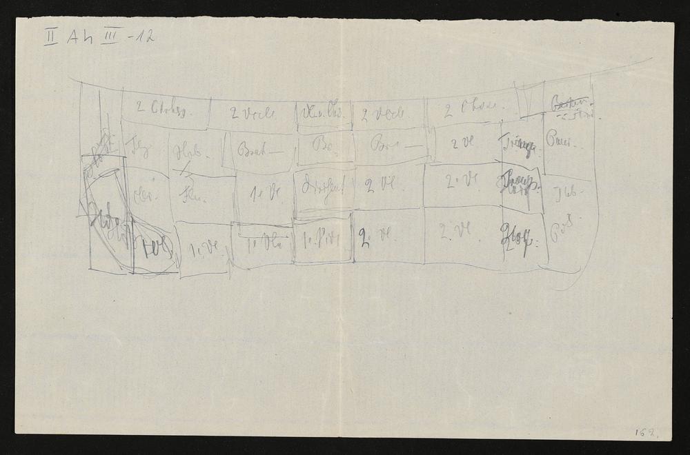Orchesteranordnung mit handschriftlichen Angaben zu Instrumentengruppen (u.a. Oboen, Bratschen, Violinen), eigenhändige Skizze von Richard Wagner