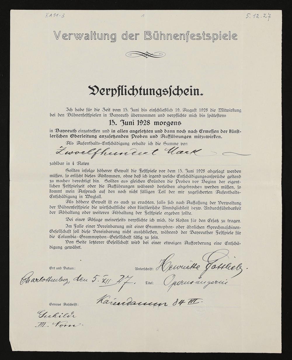 Verpflichtungsschein mit eigenhändigen Eintragungen von Henriette Gottlieb-Huth an den Verwaltungsrat der Bühnenfestspiele