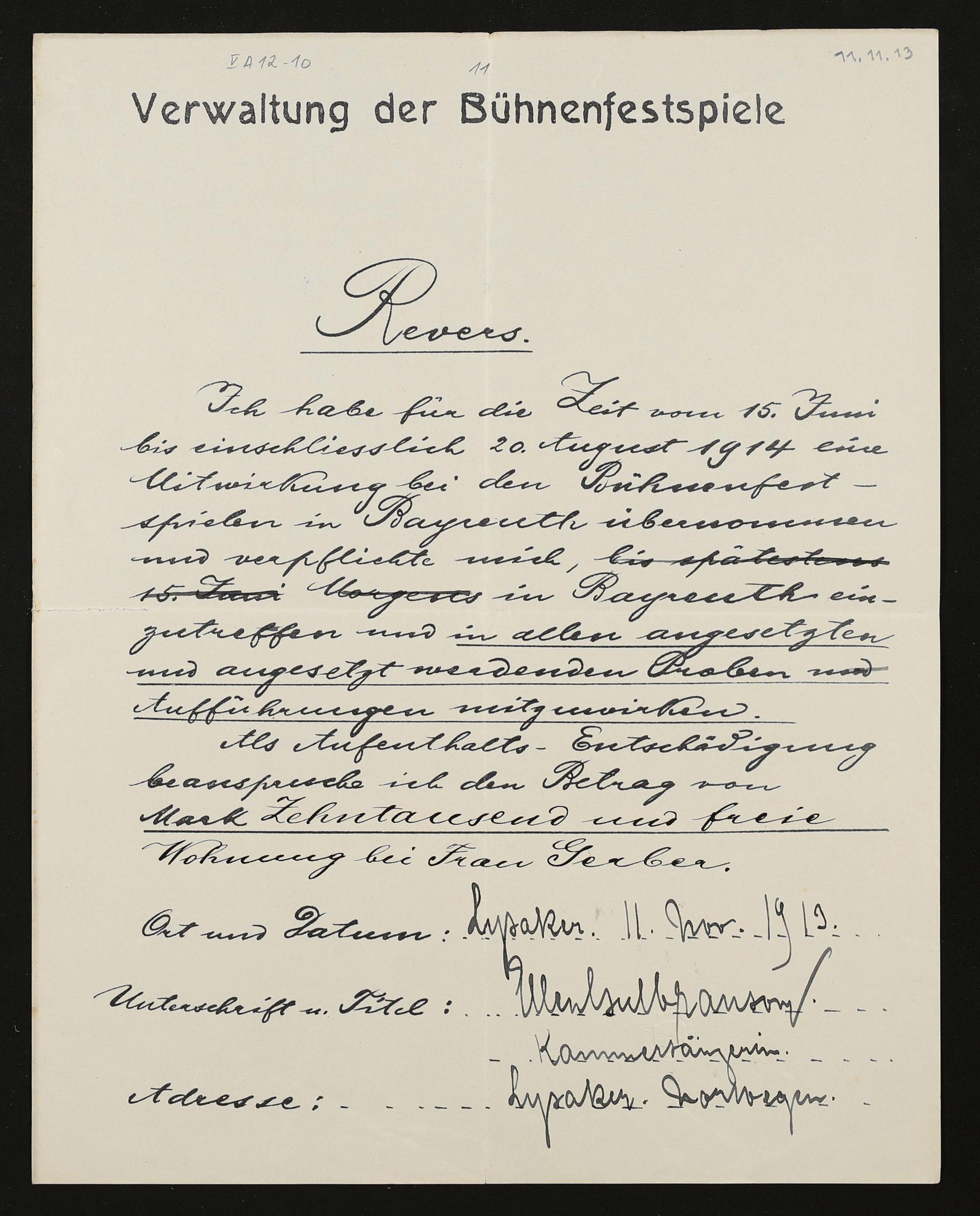 Revers mit eigenhändigen Eintragungen von Ellen Gulbranson an die Verwaltung der Bühnenfestspiele