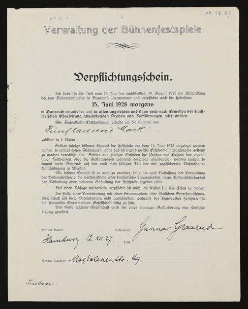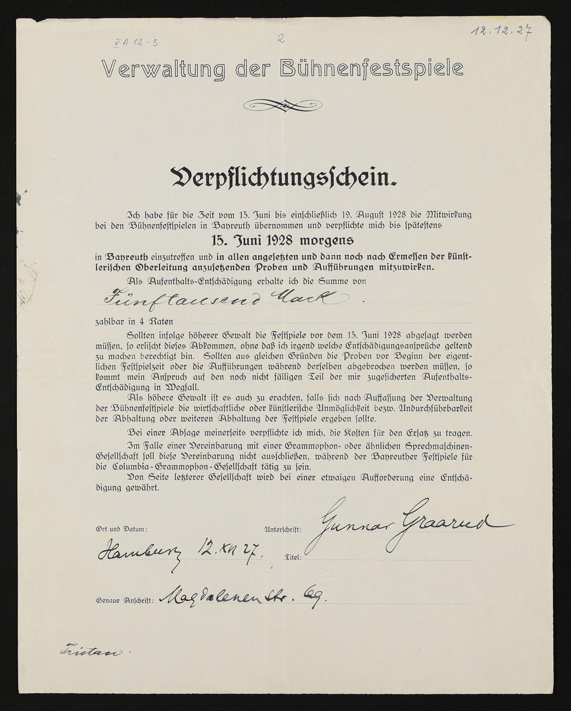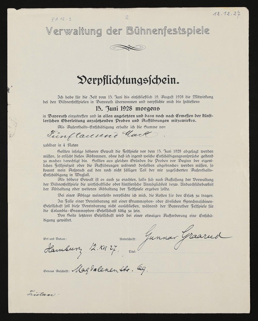 Verpflichtungsschein mit eigenhändigen Eintragungen von Gunnar Graarud an die Verwaltung der Bühnenfestspiele