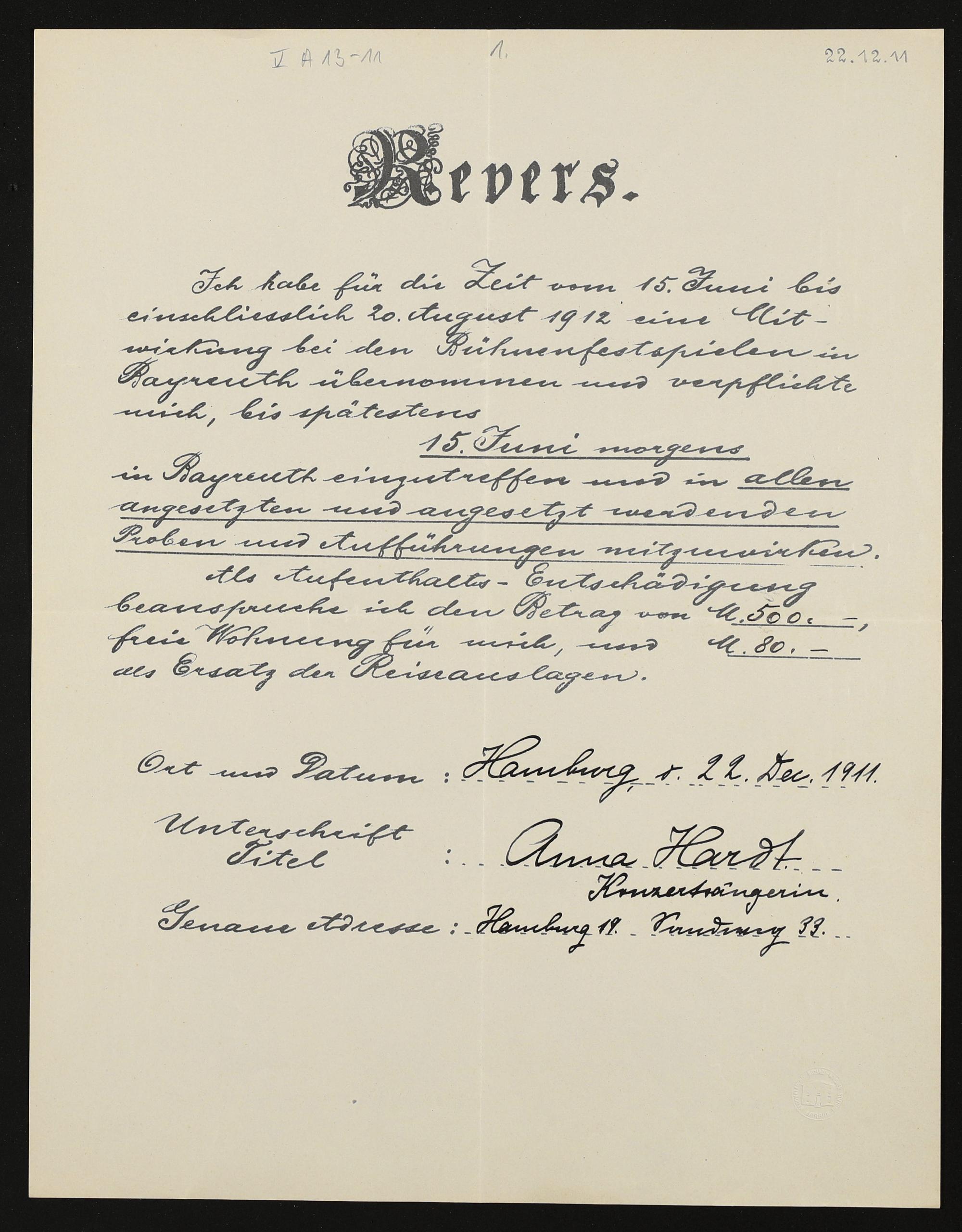 Revers mit eigenhändigen Eintragungen von Anna Hardt an die Verwaltung der Bühnenfestspiele