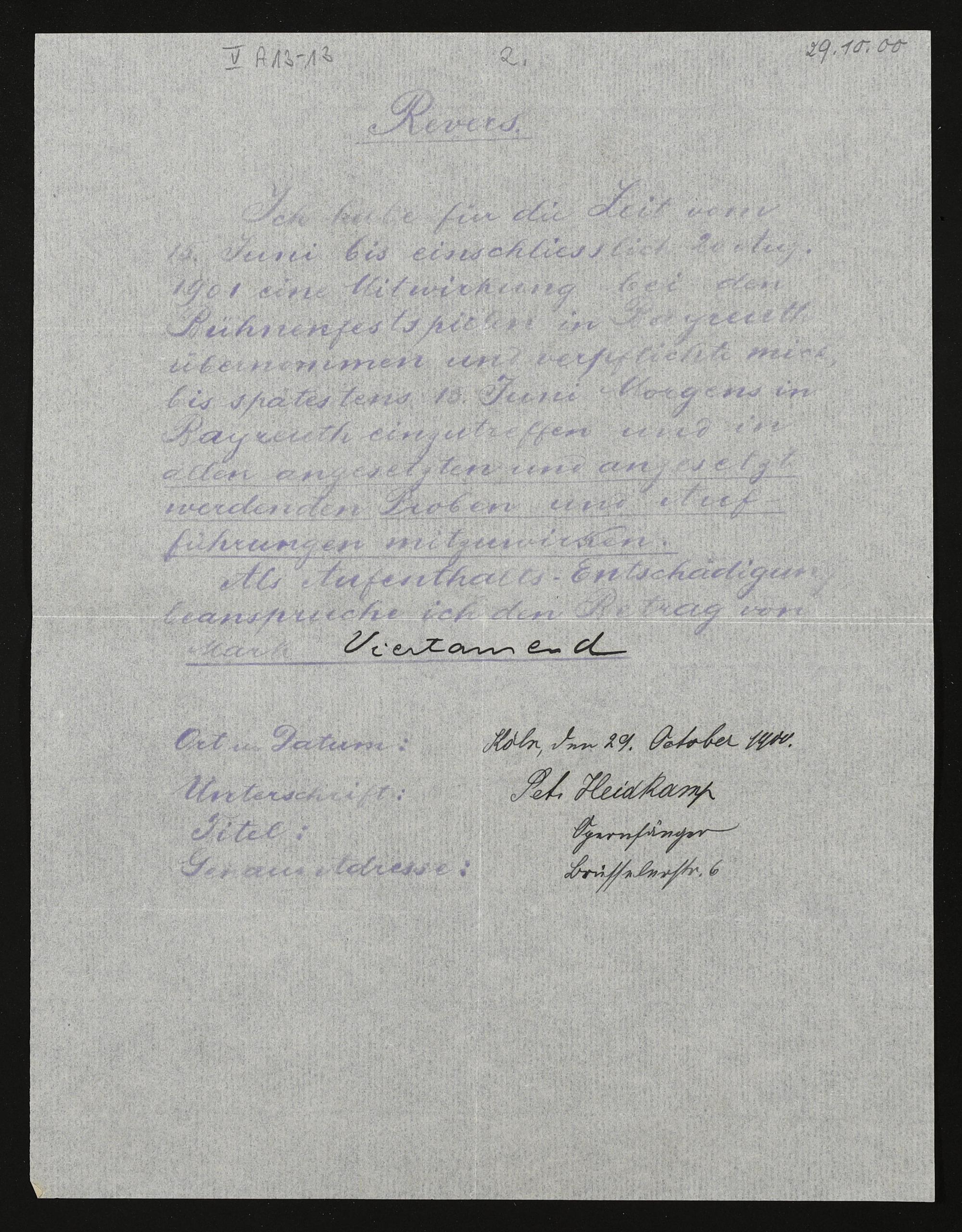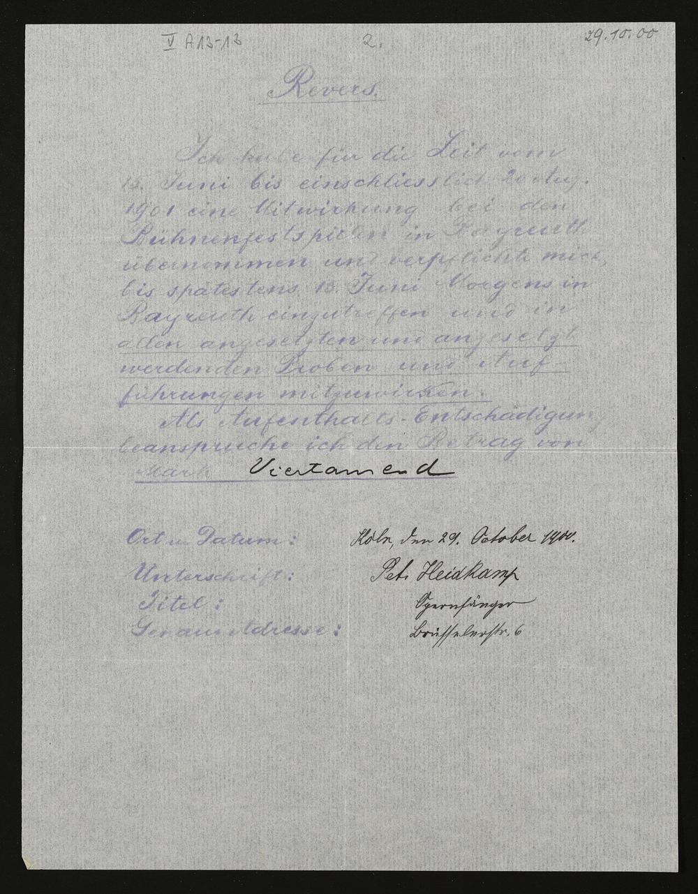 Revers mit eigenhändigen Eintragungen von Peter Heidkamp an die Verwaltung der Bühnenfestspiele