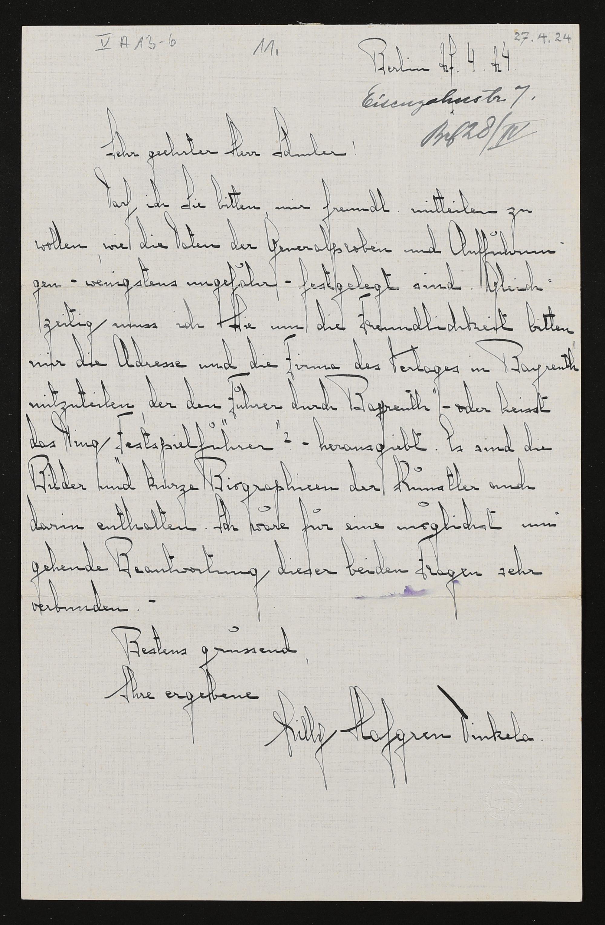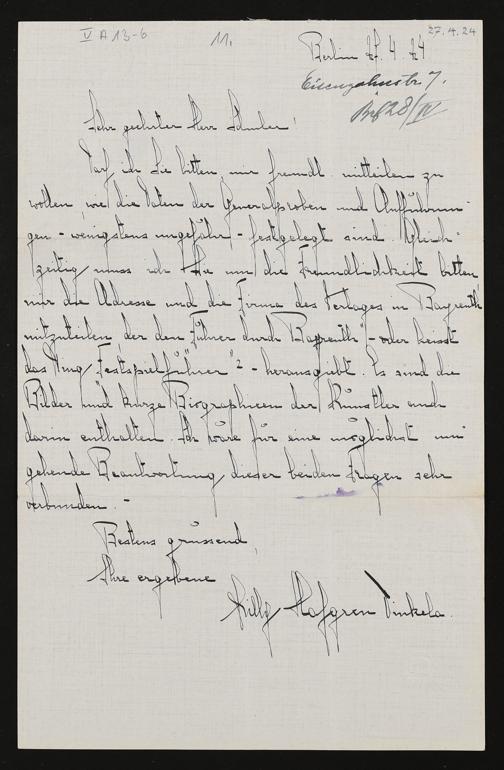 eigenhändiger Brief von Lilly Hafgren-Dinkela an Friedrich Wilhelm Schuler