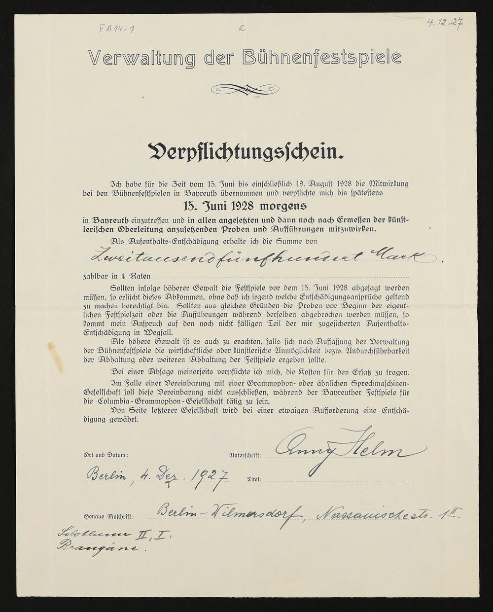 Verpflichtungsschein mit eigenhändigen Eintragungen von Anny Helm an die Verwaltung der Bühnenfestspiele