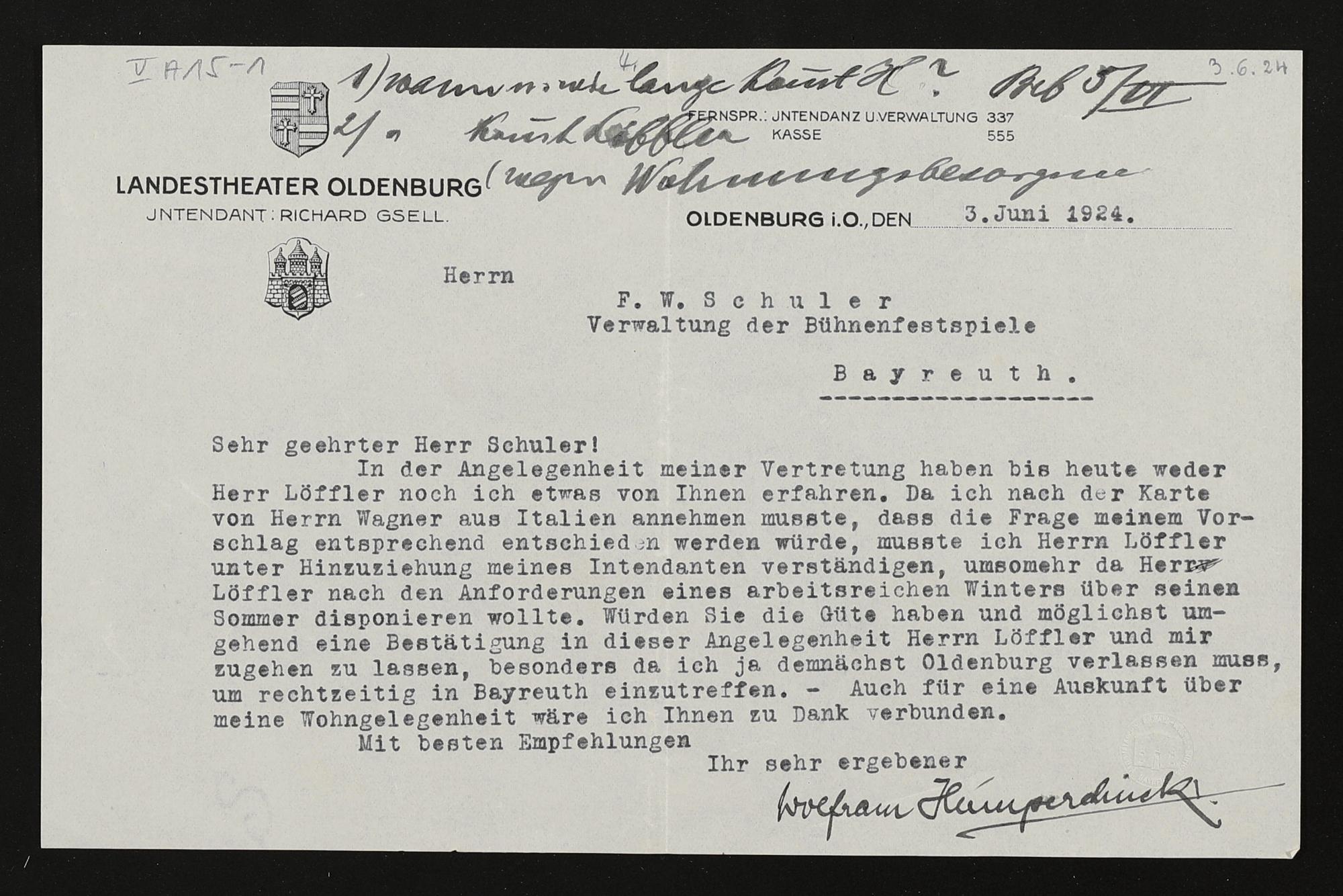 maschinenschriftlicher Brief von Wolfram Humperdinck an Friedrich Wilhelm Schuler