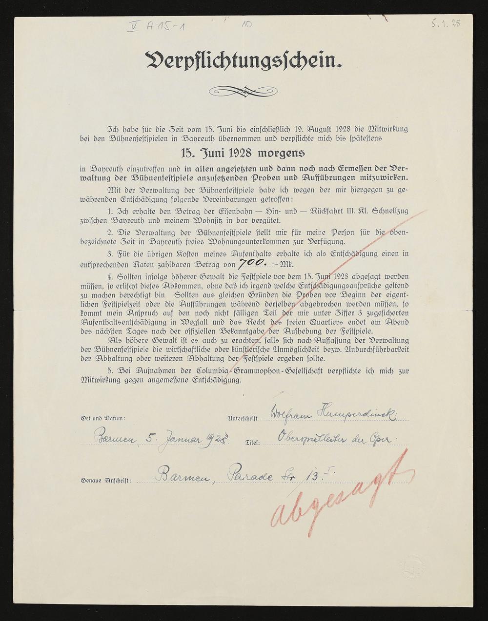 Verpflichtungsschein mit eigenhändigen Eintragungen von Wolfram Humperdinck an die Verwaltung der Bühnenfestspiele