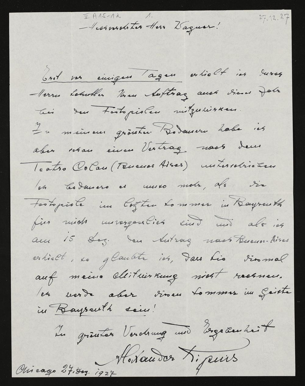 eigenhändiger Brief von Alexander Kipnis an Siegfried Wagner