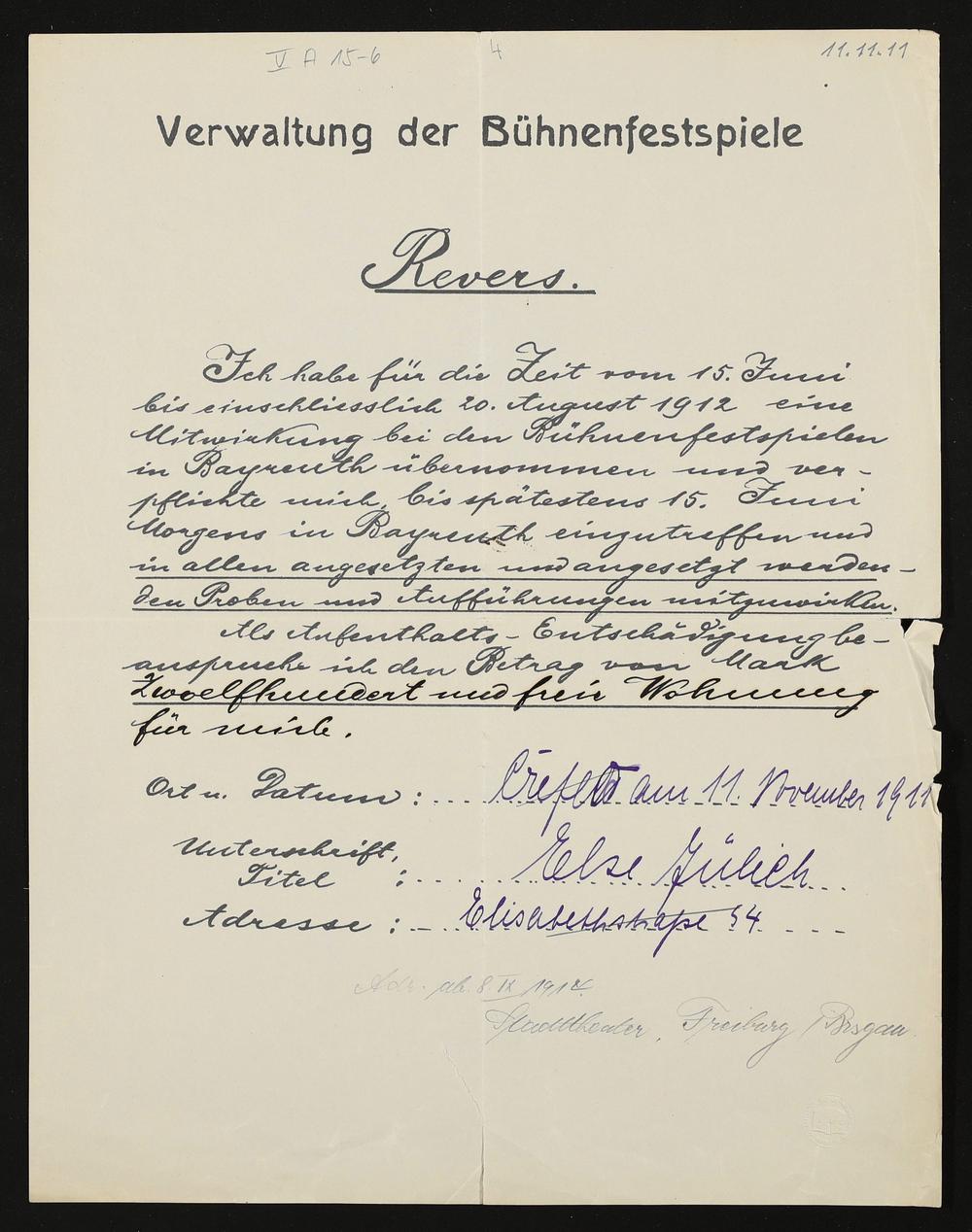Revers mit eigenhändigen Eintragungen von Else Jülich an die Verwaltung der Bühnenfestspiele
