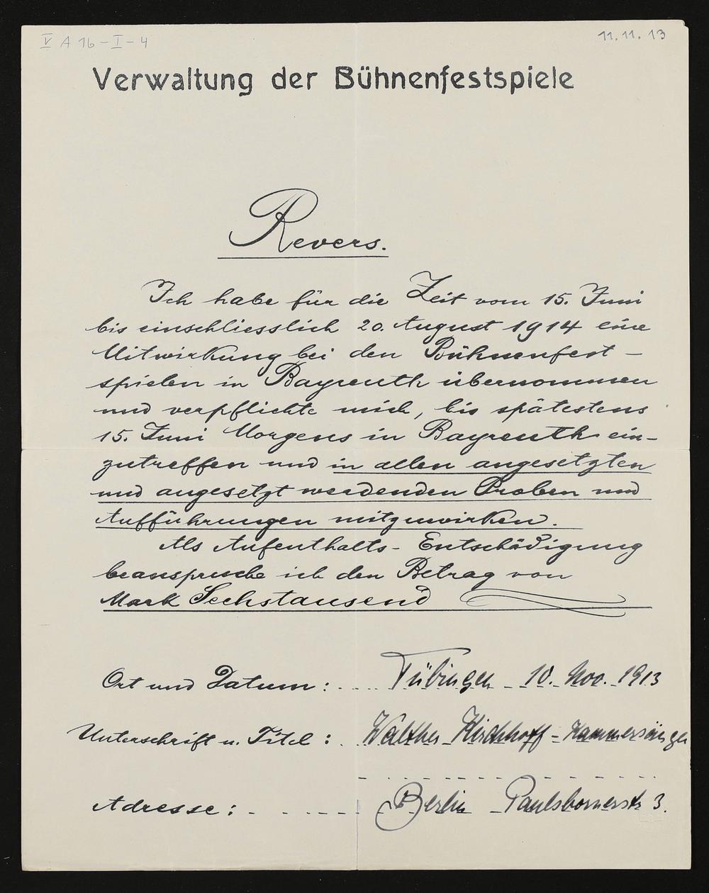 Revers mit eigenhändigen Eintragungen von Walther Kirchhoff an die Verwaltung der Bühnenfestspiele
