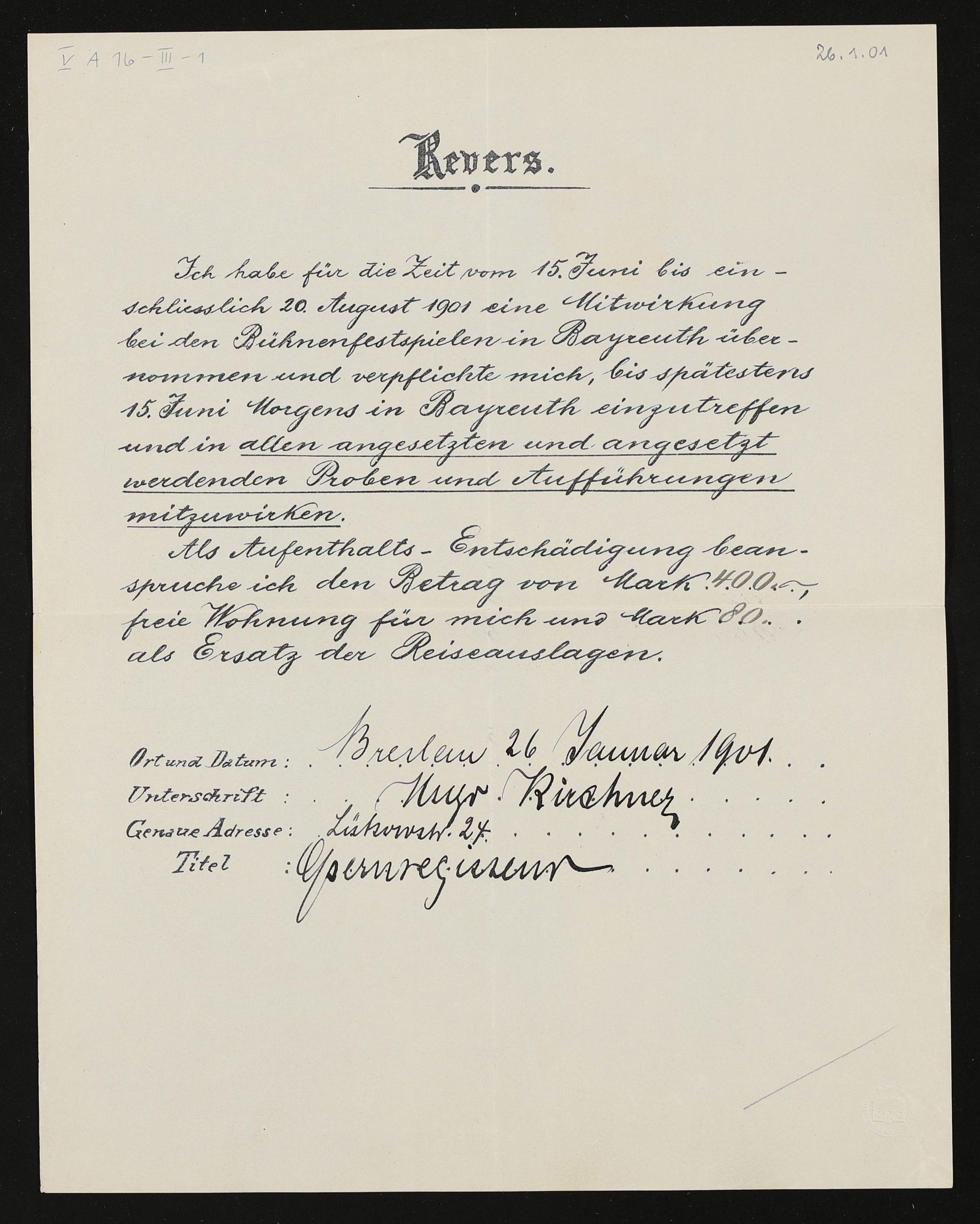 Revers mit eigenhändigen Eintragungen von Hugo Kirchner an die Verwaltung der Bühnenfestspiele