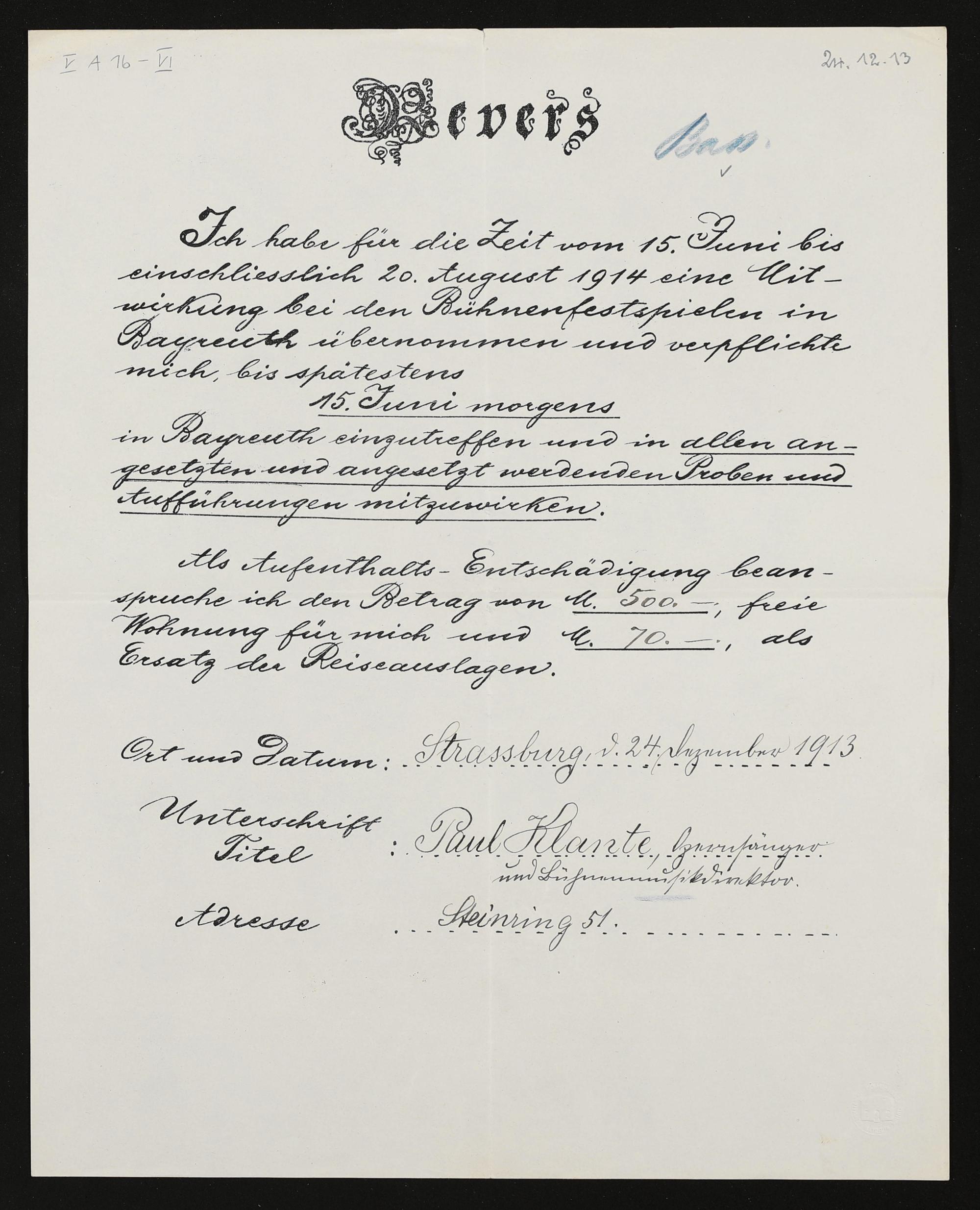 Revers mit eigenhändigen Eintragungen von Paul Klante an die Verwaltung der Bühnenfestspiele