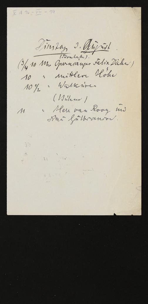 eigenhändiger Probenplan von Julius Kniese für Dienstag, 3. August [ohne Jahr]