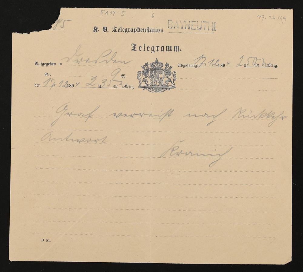 Telegramm von Friedrich Kranich senior an Adolf von Gross