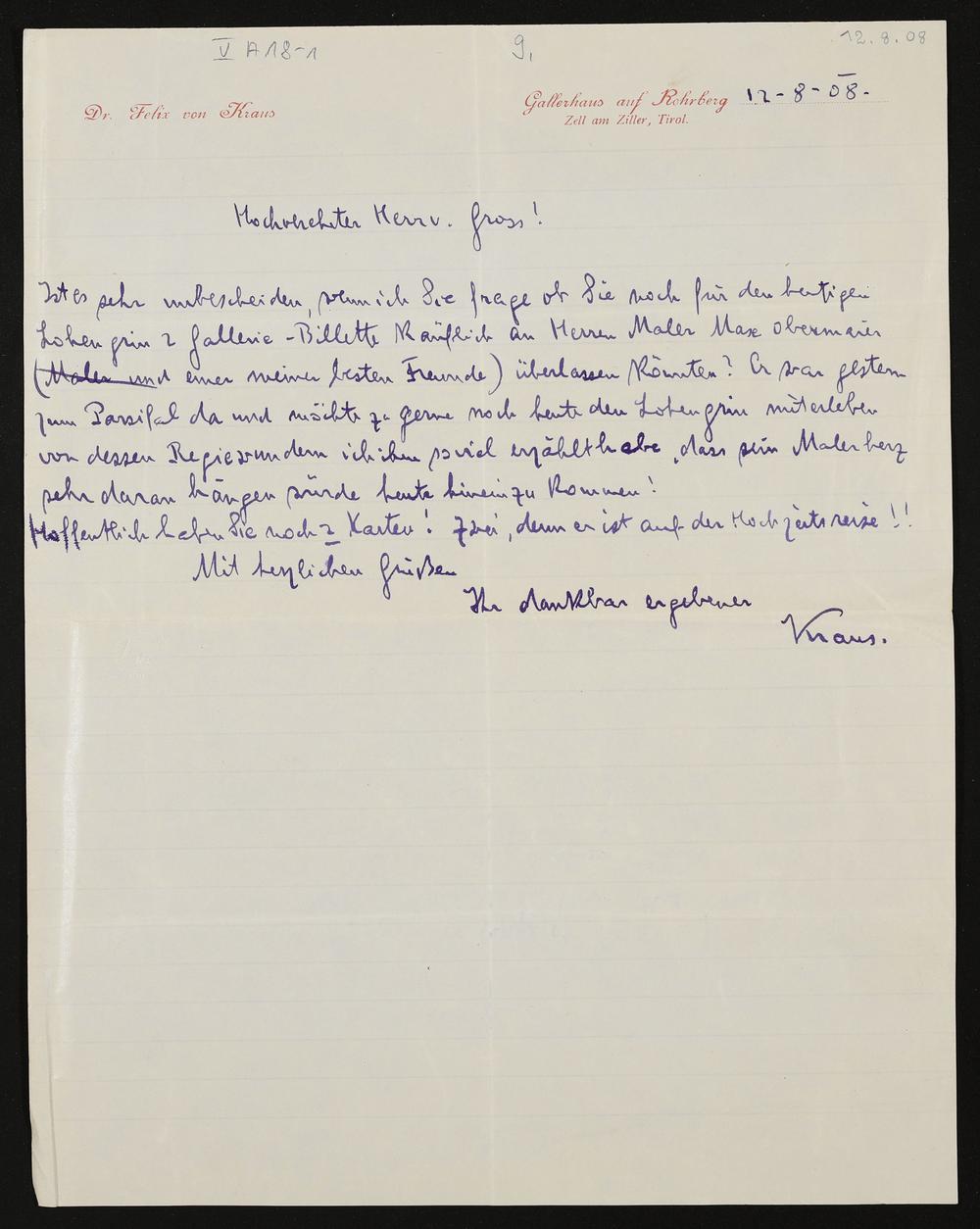 eigenhändiger Brief von Felix von Kraus an Adolf von Gross