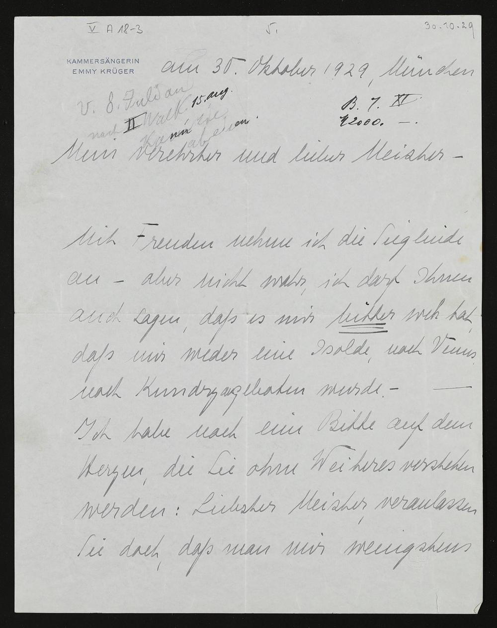 eigenhändiger Brief von Emmy Krüger an Siegfried Wagner