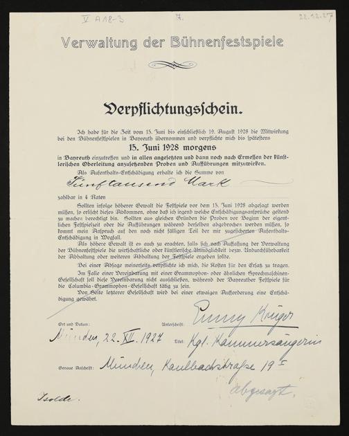 Verpflichtungsschein mit eigenhändigen Eintragungen von Emmy Krüger an die Verwaltung der Bühnenfestspiele