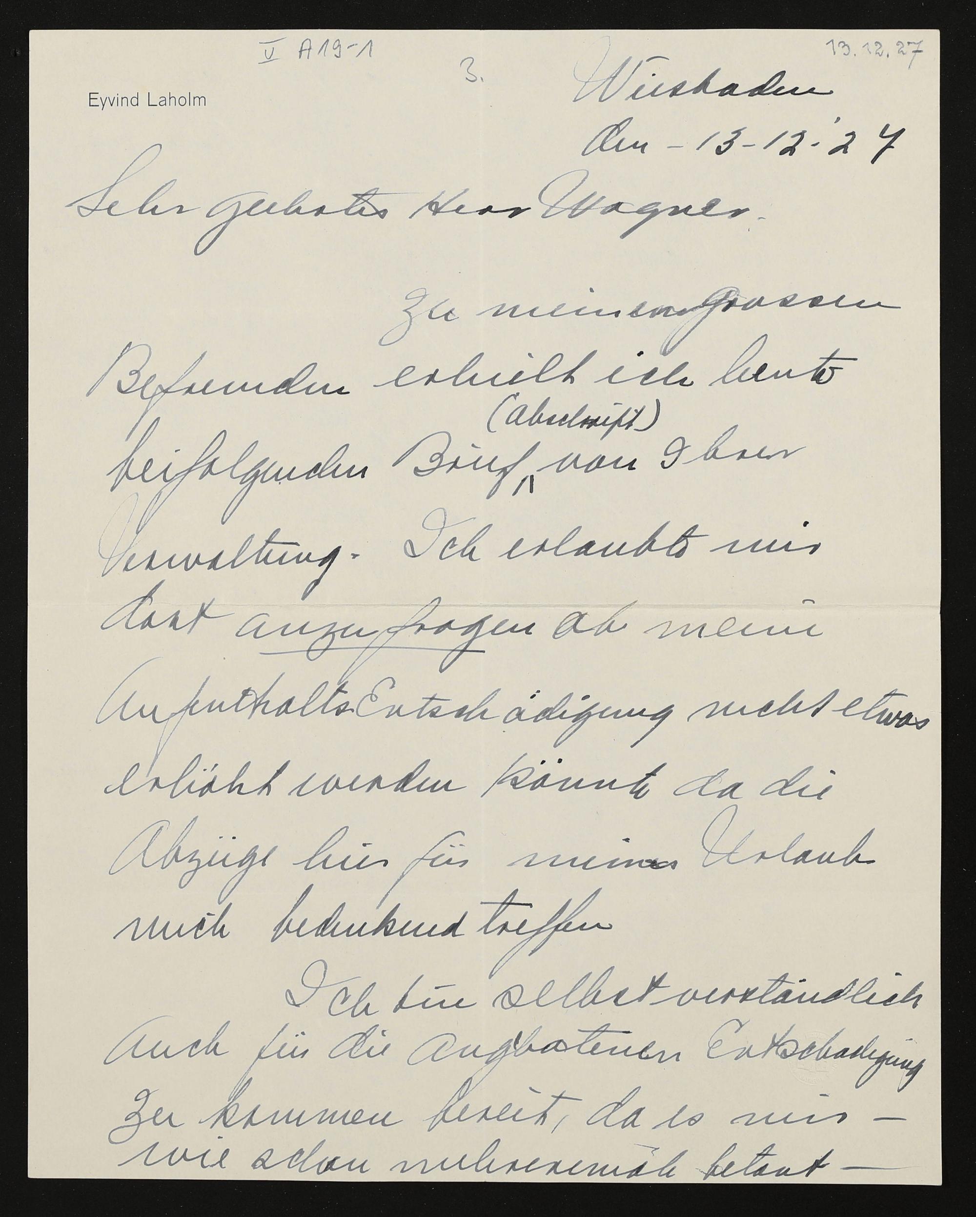 eigenhändiger Brief von Eyvind Laholm an Siegfried Wagner