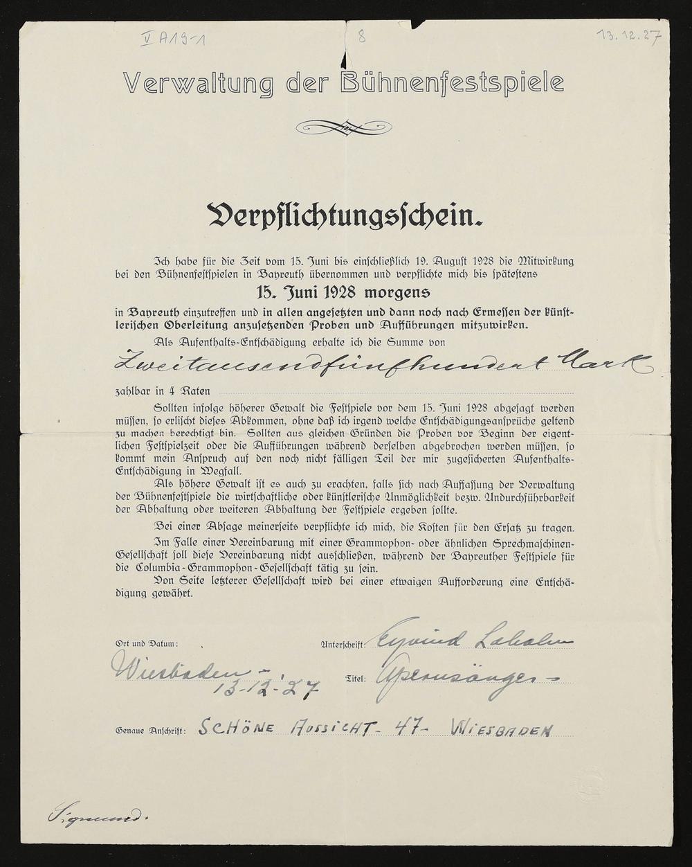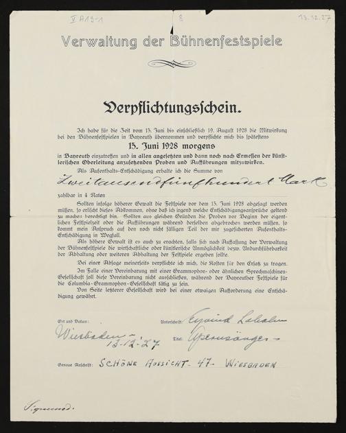 Verpflichtungsschein mit eigenhändigen Eintragungen von Eyvind Laholm an die Verwaltung der Bühnenfestspiele