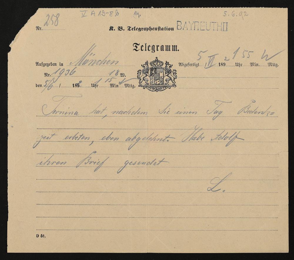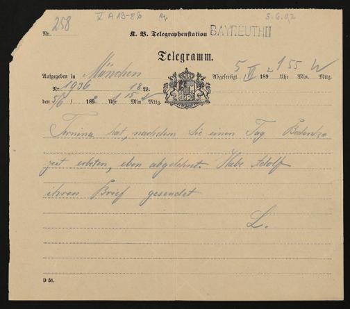 Telegramm von Hermann Levi an Cosima Wagner