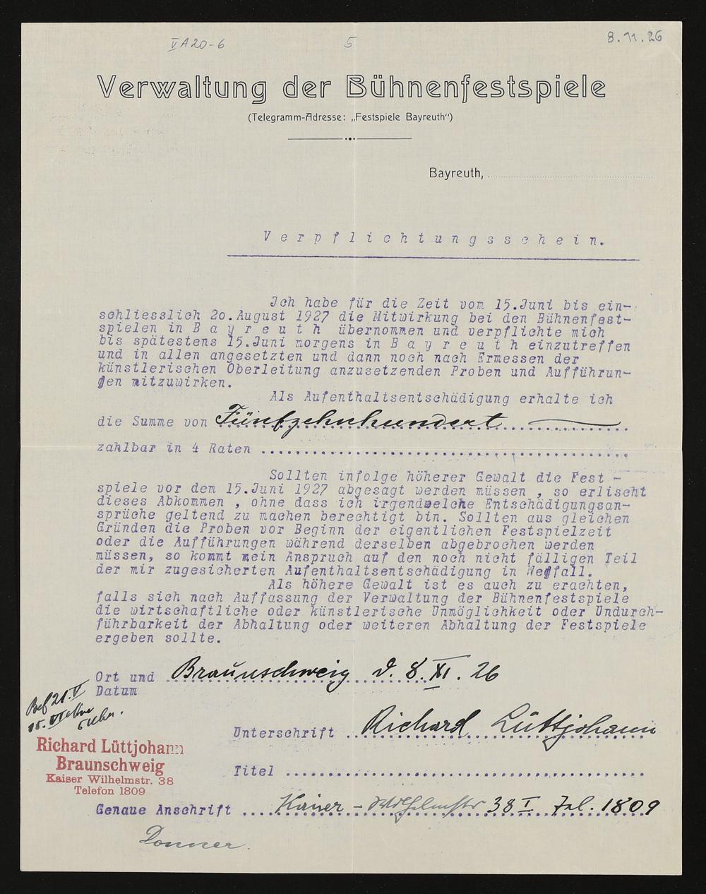 Verpflichtungsschein mit eigenhändigen Eintragungen von Richard Lüttjohann an die Verwaltung der Bayreuther Bühnenfestspiele