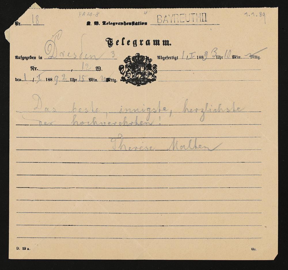 Telegramm von Therese Malten an Cosima Wagner