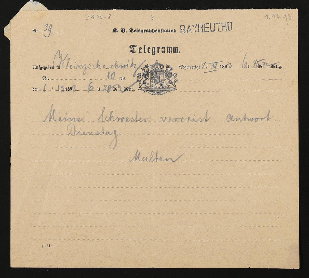 Telegramm von Therese Malten an Adolf von Gross