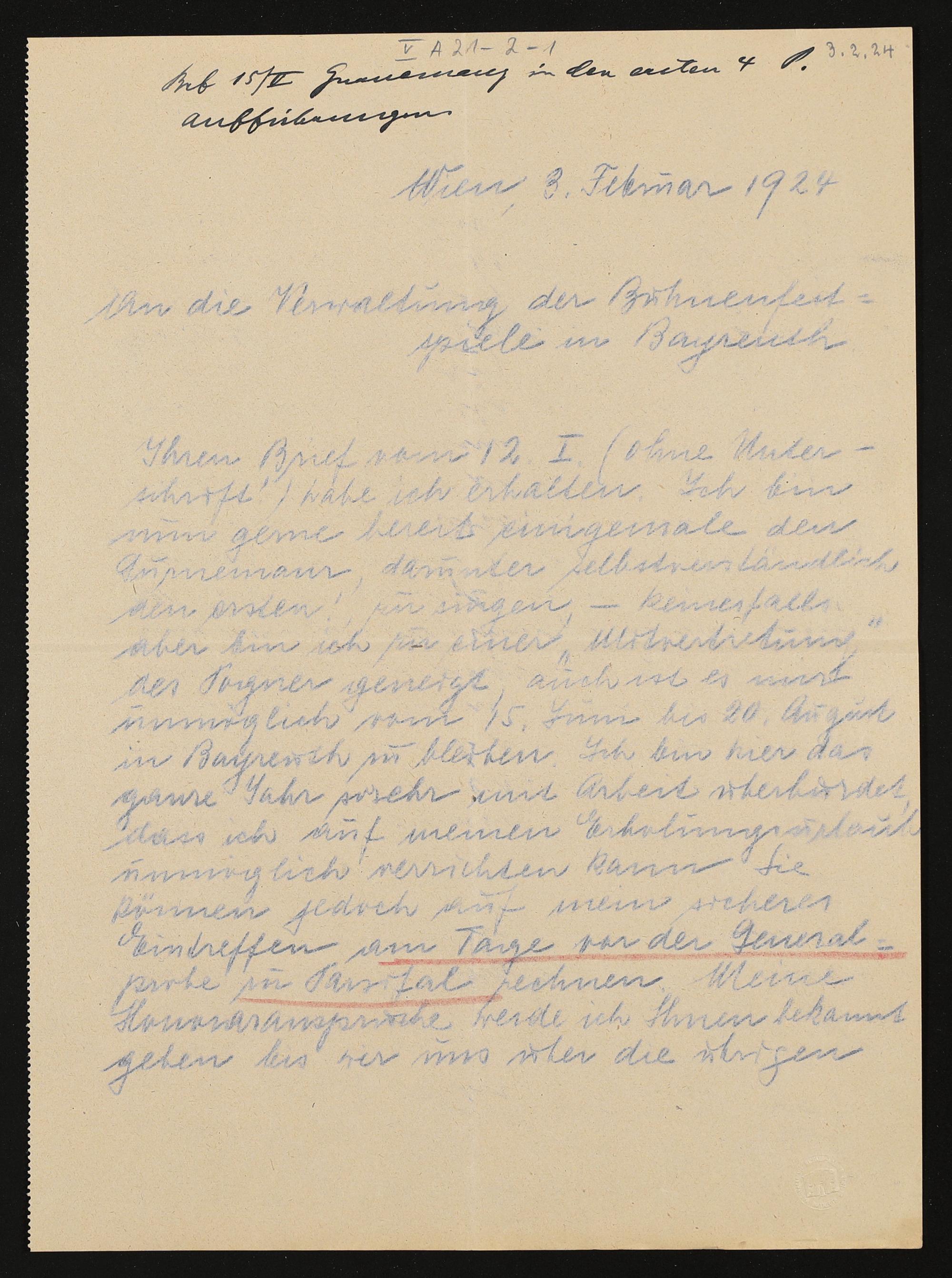 eigenhändiger Brief von Richard Mayr an die Verwaltung der Bühnenfestspiele