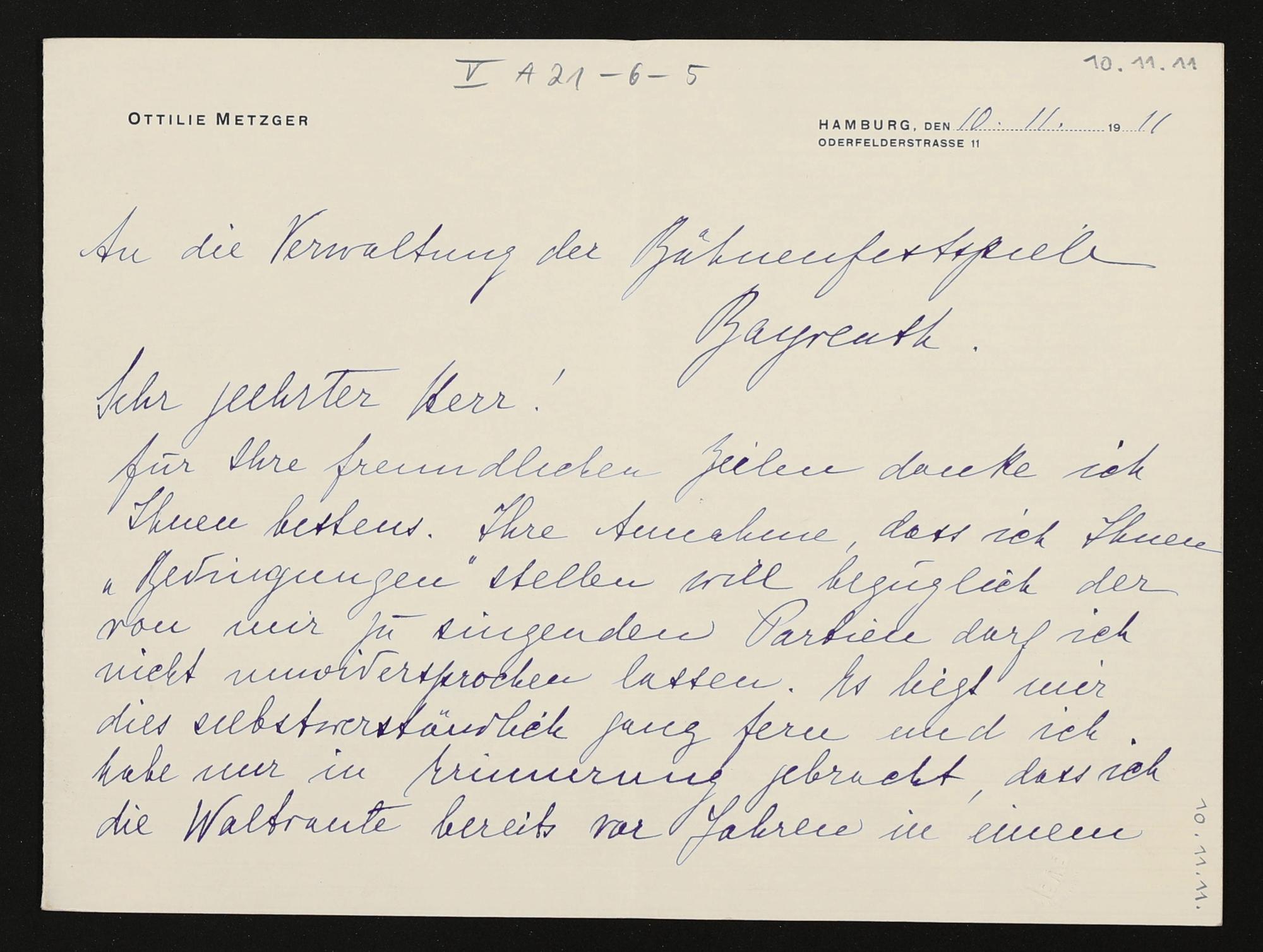 eigenhändige Briefkarte von Ottilie Metzger-Lattermann an die Verwaltung der Bühnenfestspiele