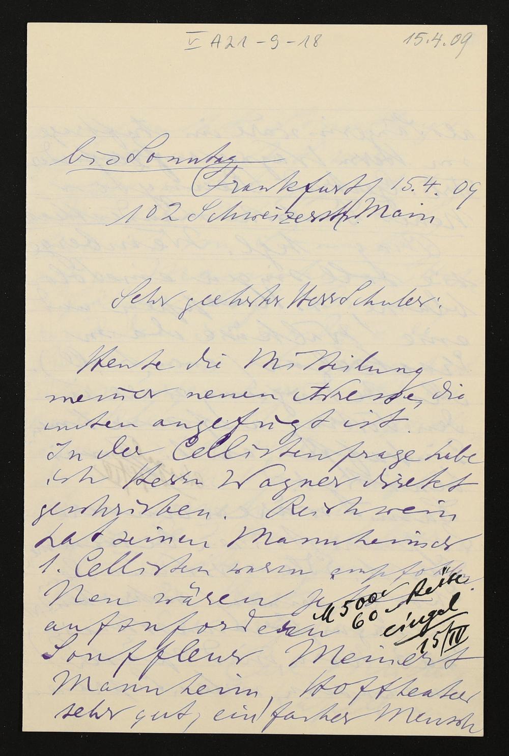 eigenhändiger Brief von Carl Müller an Friedrich Wilhelm Schuler, beiliegend: eigenhändiger Brief von Gertrude Rennyson an Siegfried Wagner, eigenhändige Zeilen von F. W. Schuler an Carl Müller
