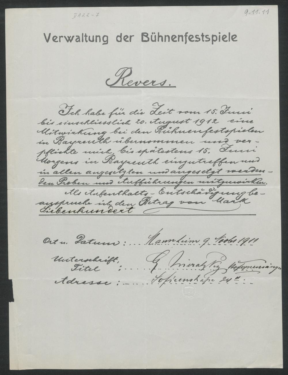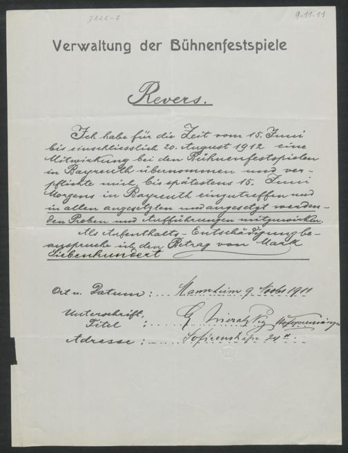 Revers mit eigenhändigen Eintragungen von Georg Nieratzky an die Verwaltung der Bühnenfestspiele