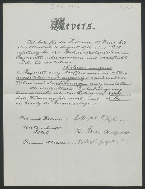 Revers mit eigenhändigen Eintragungen von Theo Raven an die Verwaltung der Bühnenfestspiele