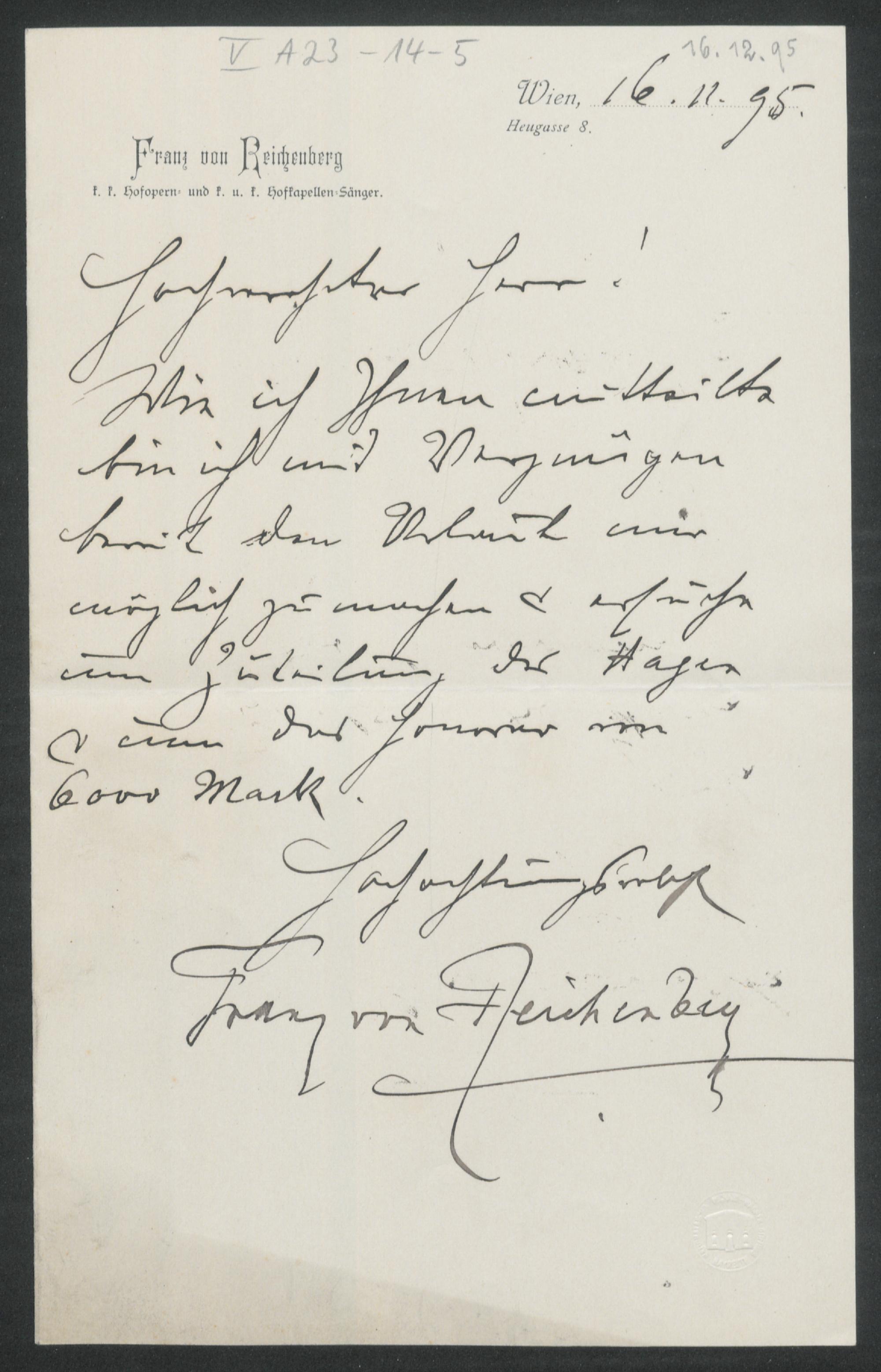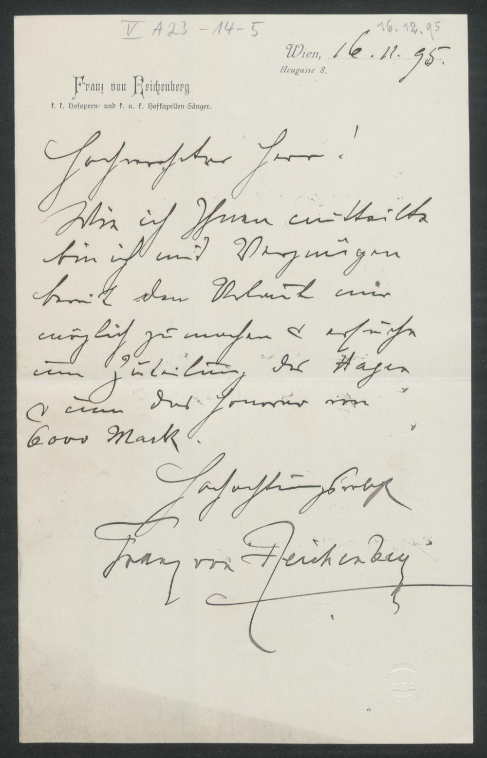 eigenhändiger Brief von Franz von Reichenberg an einen unbekannten Empfänger