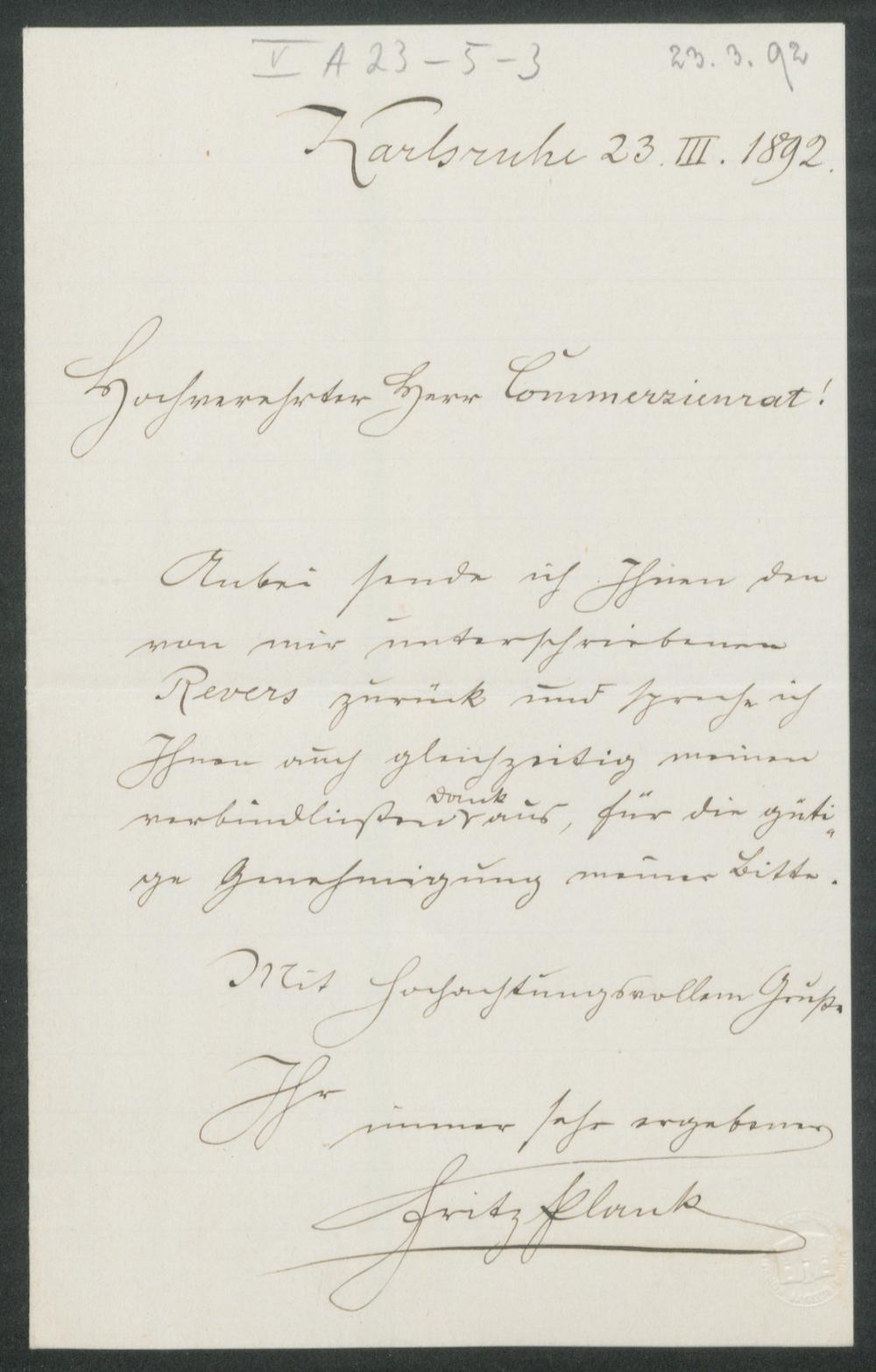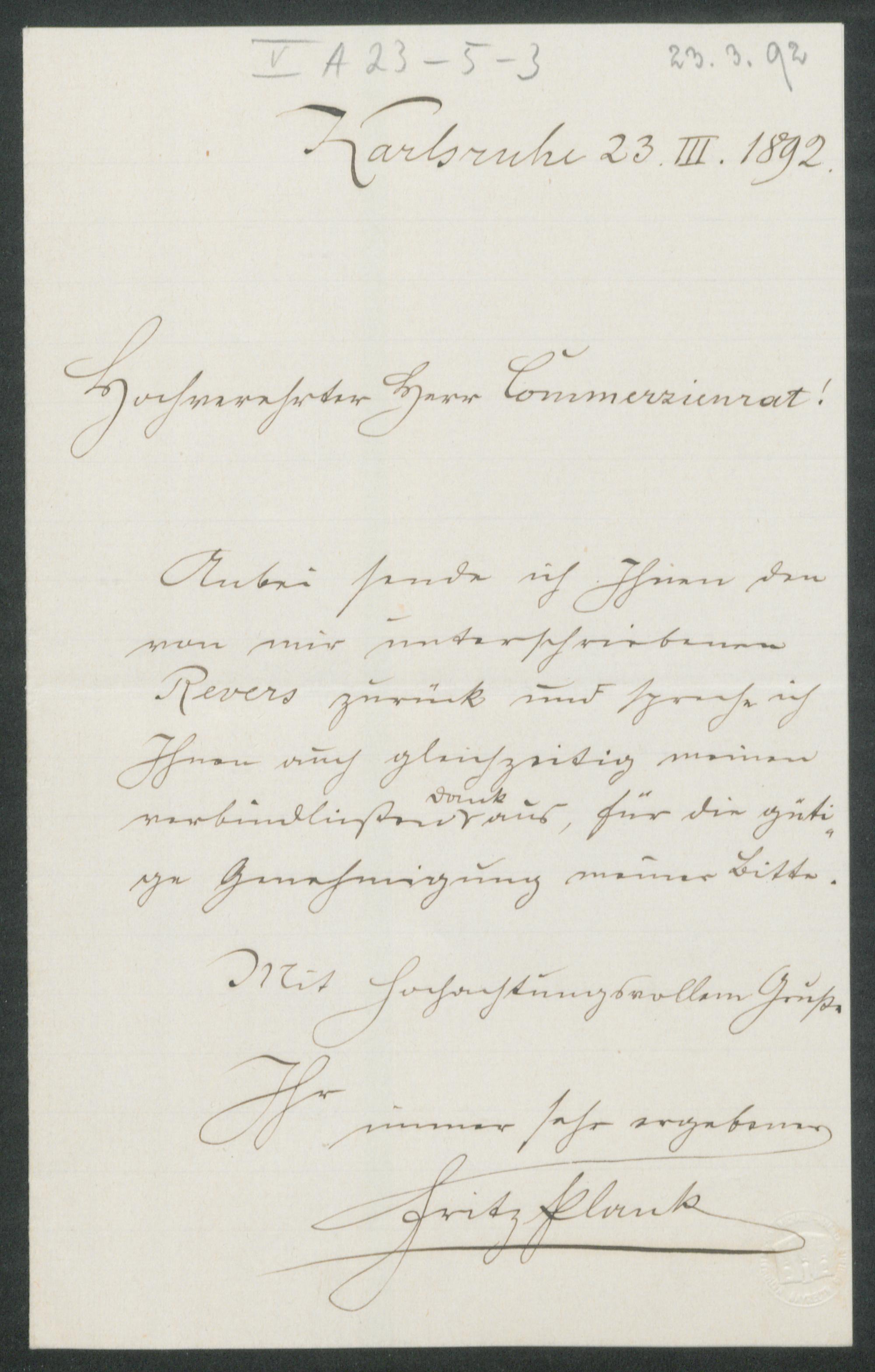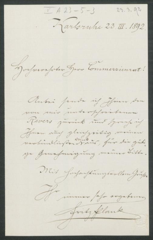 eigenhändiger Brief von Fritz Plank an Adolf von Gross