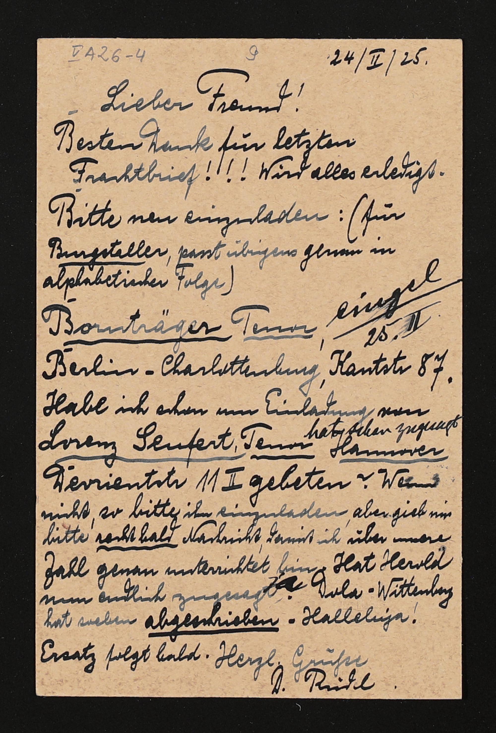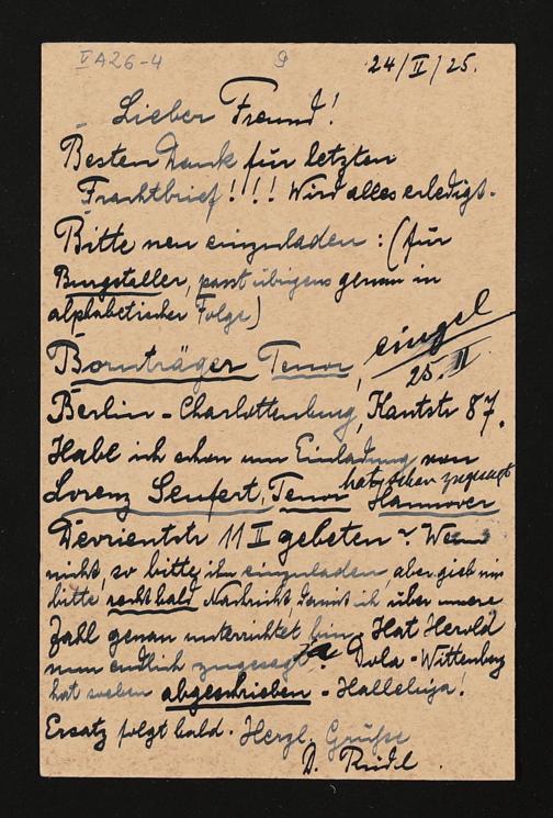 eigenhändige Postkarte von Hugo Rüdel an Friedrich Wilhelm Schuler