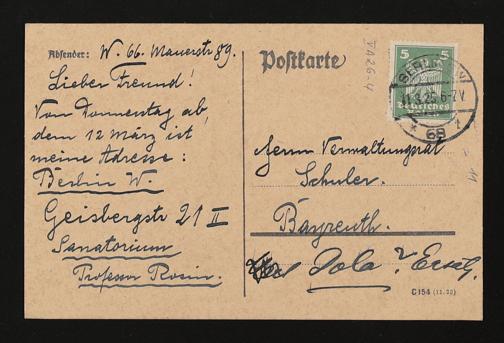 eigenhändige Postkarte von Hugo Rüdel an Friedrich Wilhelm Schuler