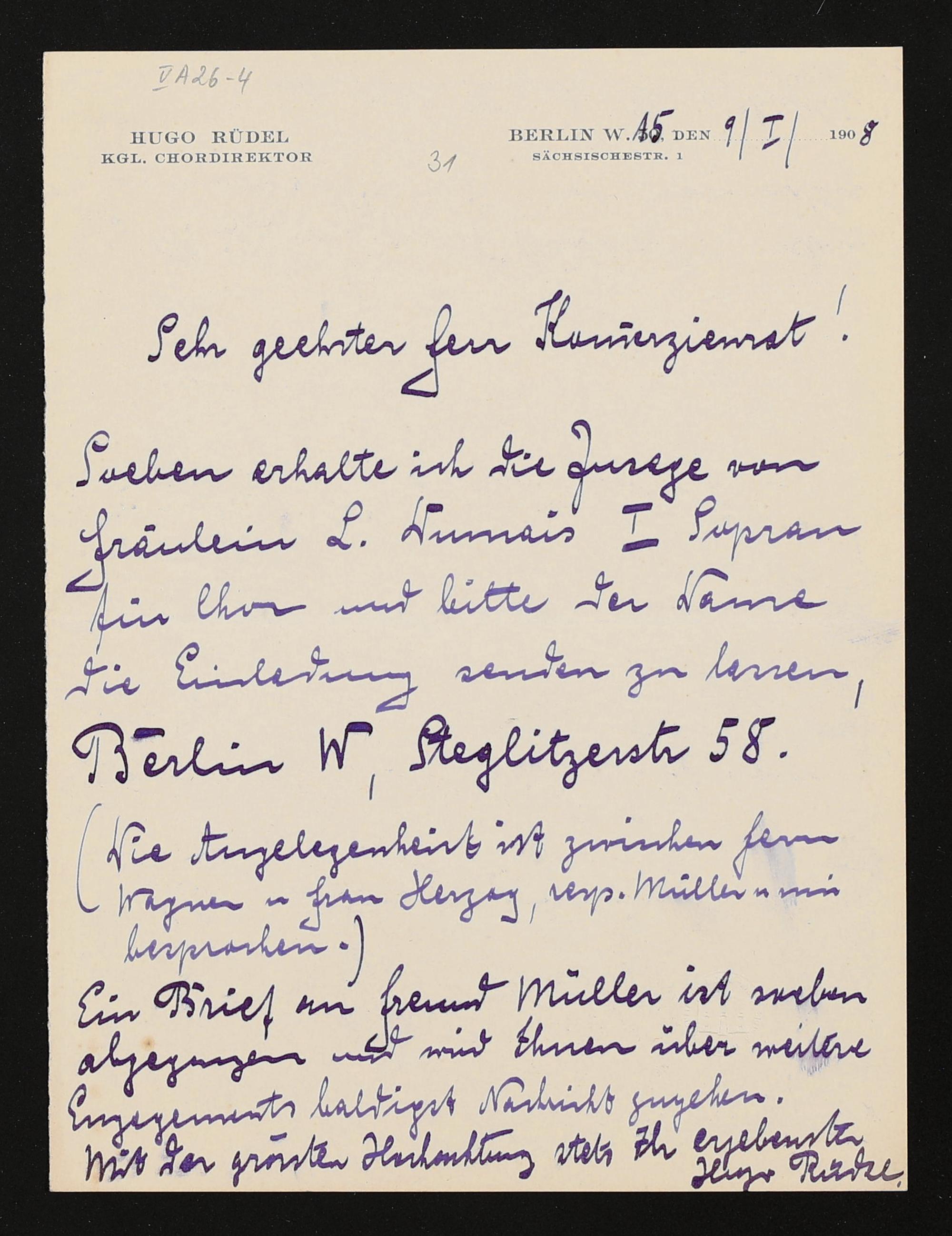 eigenhändiger Brief von Hugo Rüdel an Adolf von Gross