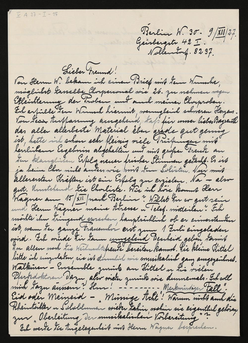 eigenhändiger Brief von Hugo Rüdel an Friedrich Wilhelm Schuler, eigenhändige Zeilen von Karl Muck mutmaßlich an Hugo Rüdel