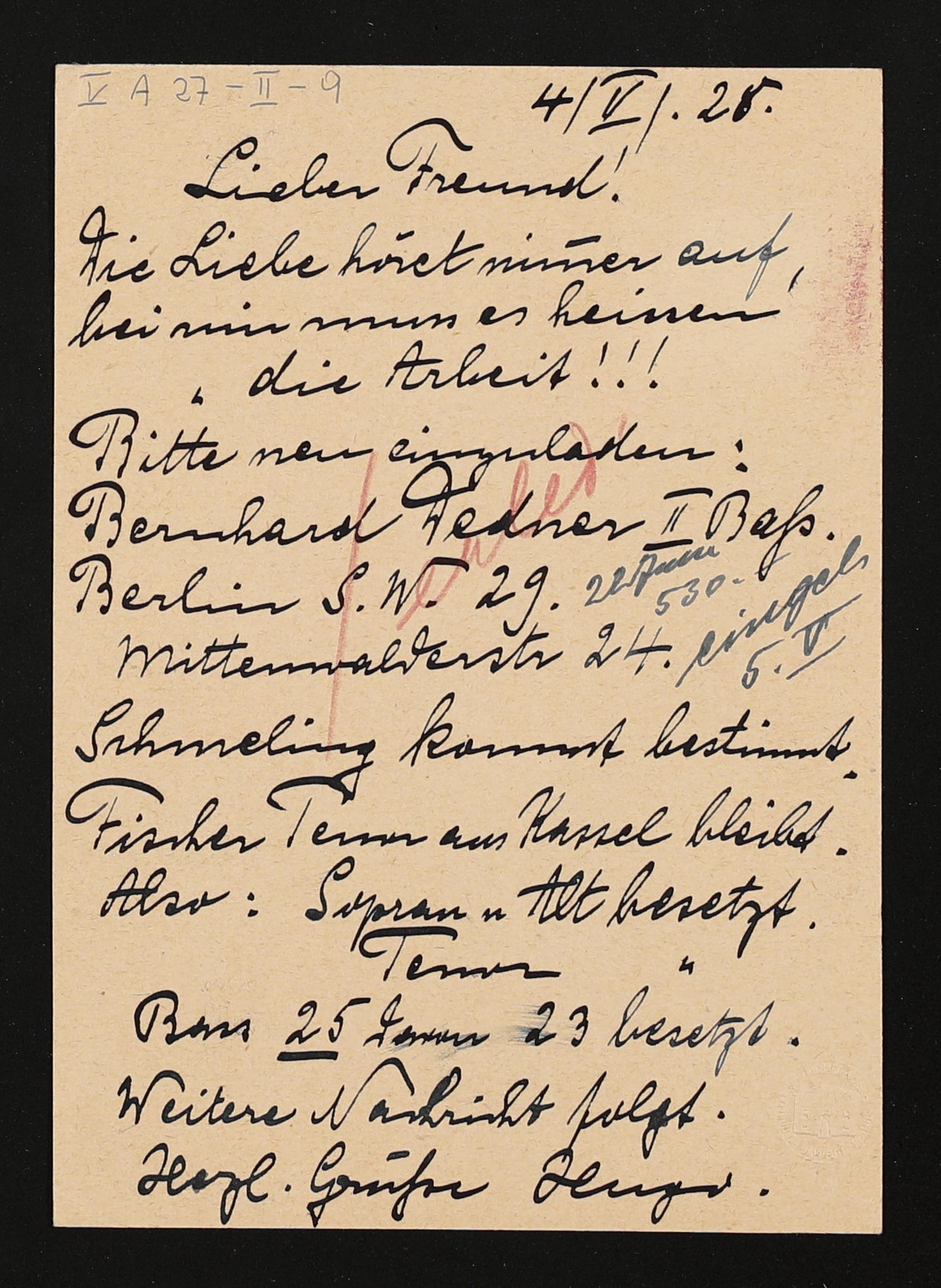 eigenhändige Postkarte von Hugo Rüdel an Friedrich Wilhelm Schuler