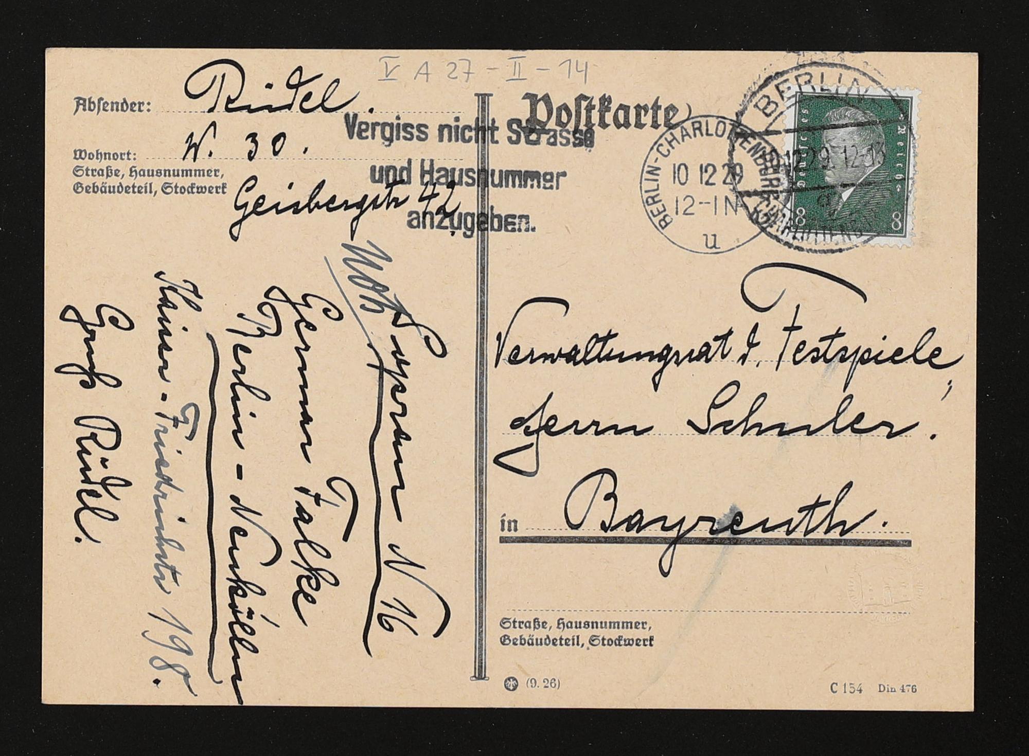 eigenhändige Postkarte von Hugo Rüdel an Friedrich Wilhelm Schuler
