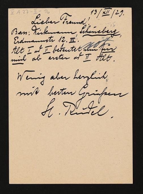 eigenhändige Postkarte von Hugo Rüdel an Friedrich Wilhelm Schuler