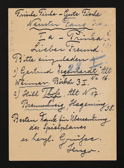 eigenhändige Postkarte von Hugo Rüdel an Friedrich Wilhelm Schuler