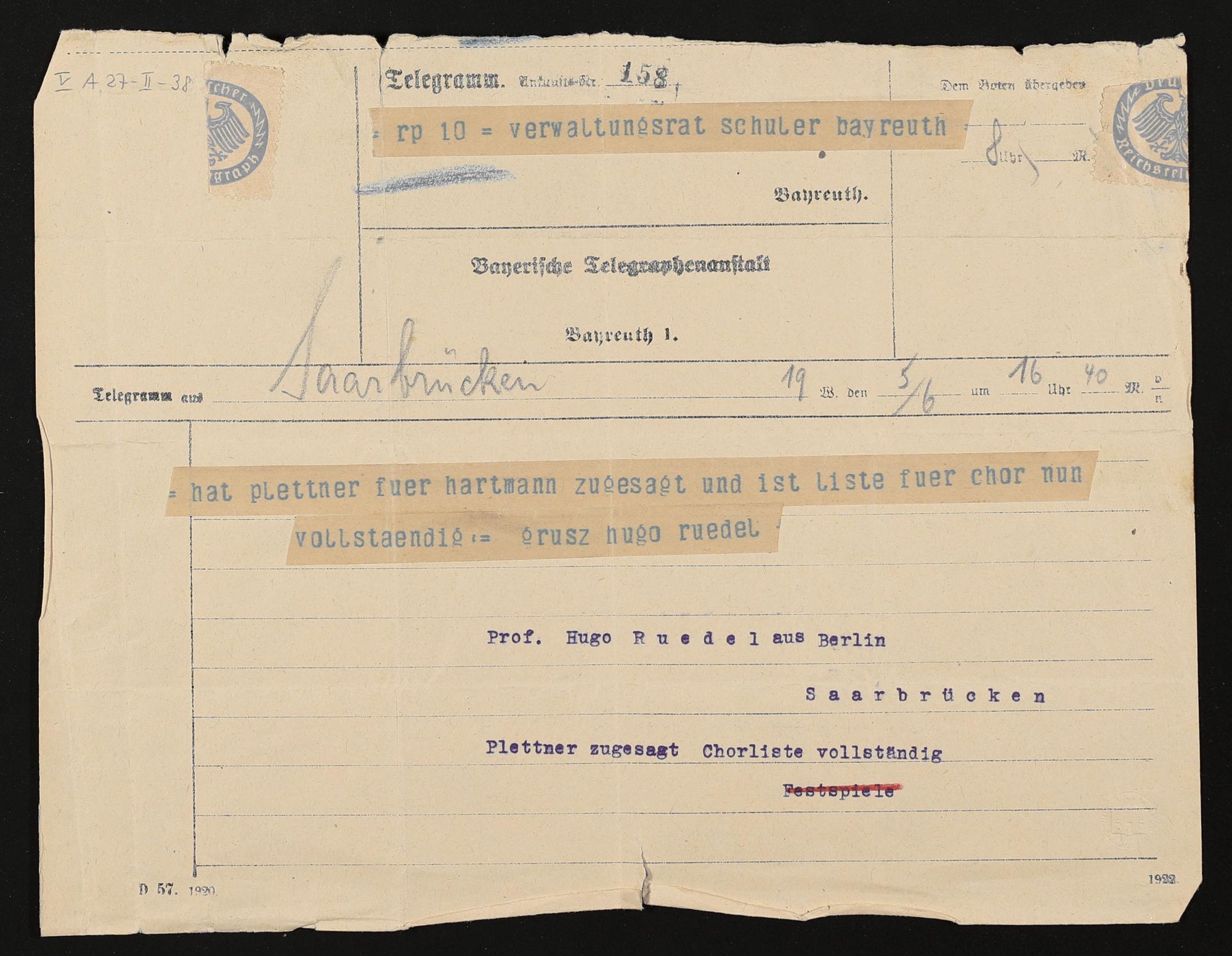 Telegramm von Hugo Rüdel an Friedrich Wilhelm Schuler