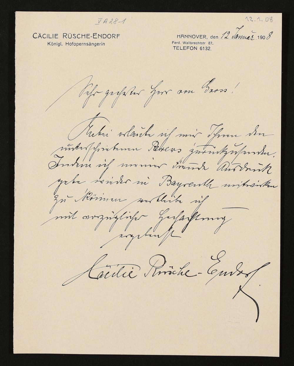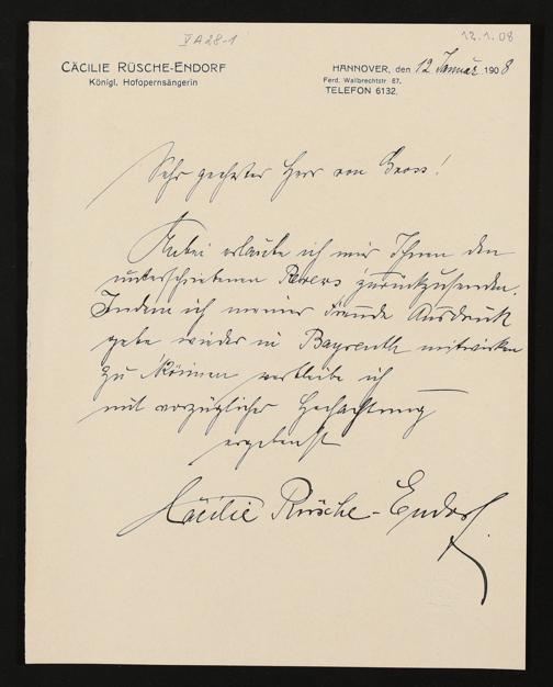 eigenhändiger Brief von Cäcilie Rüsche-Endorf an Adolf von Gross