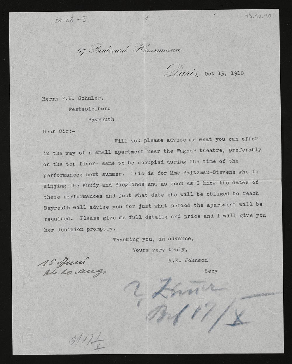 maschinenschriftlicher Brief von Marie E. Johnson im Auftrag von Minnie Saltzmann-Stevens an Friedrich Wilhelm Schuler