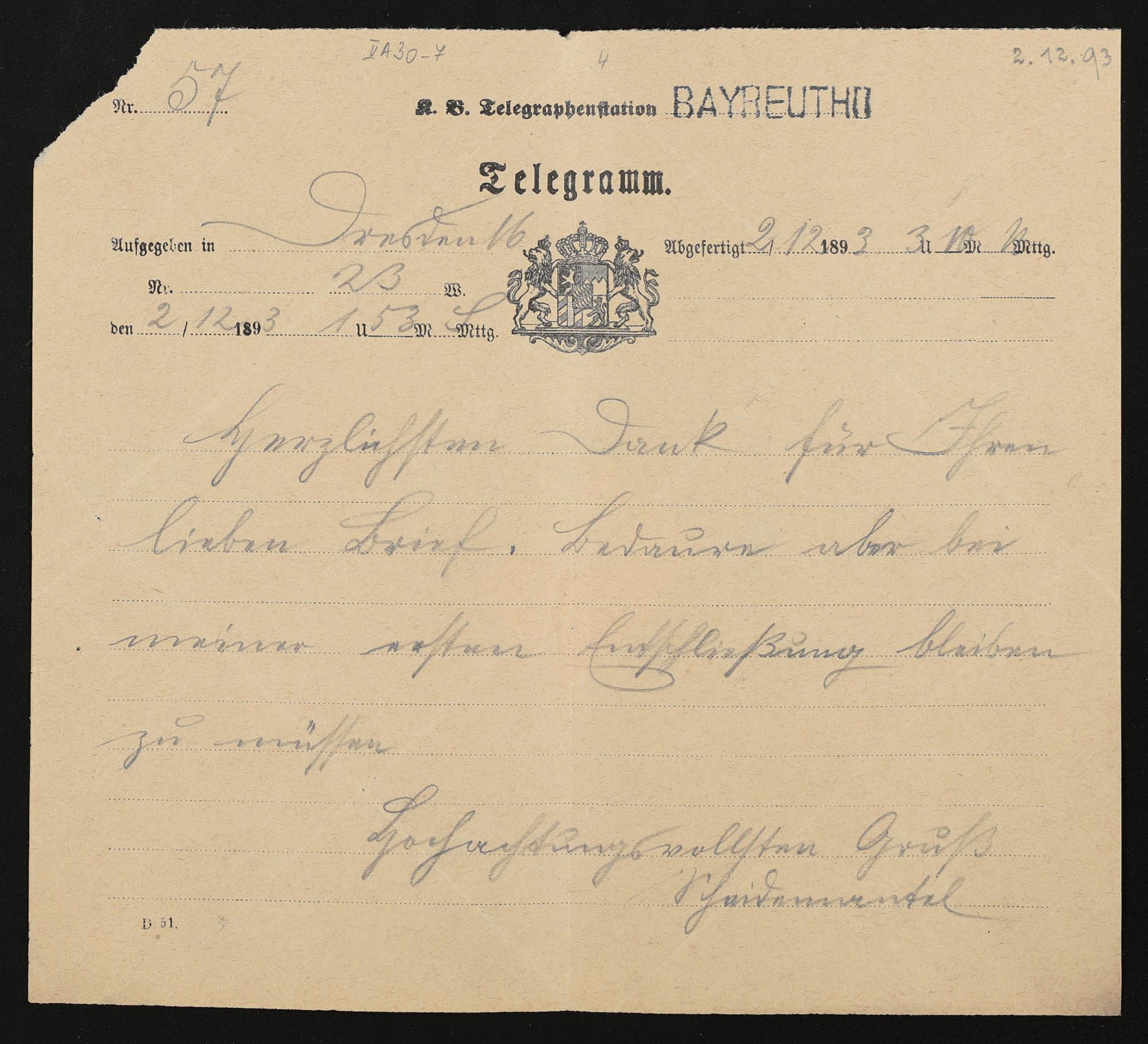 Telegramm von Karl Scheidemantel an Cosima Wagner