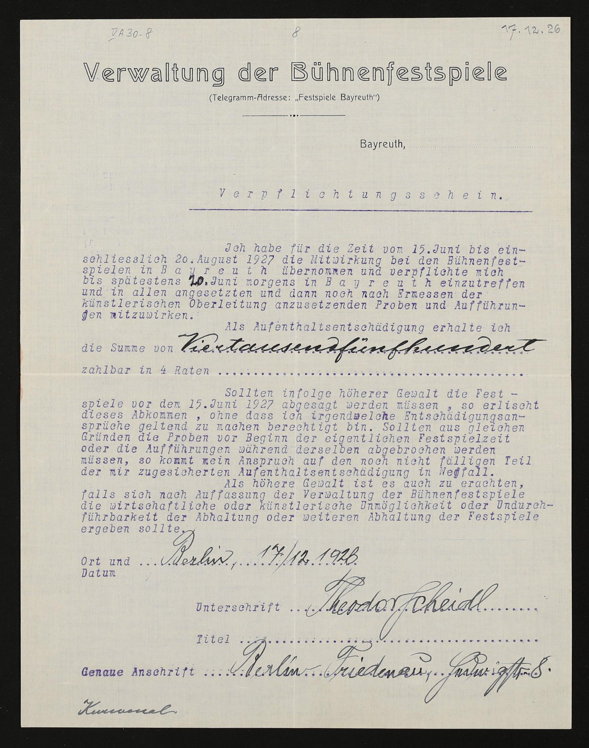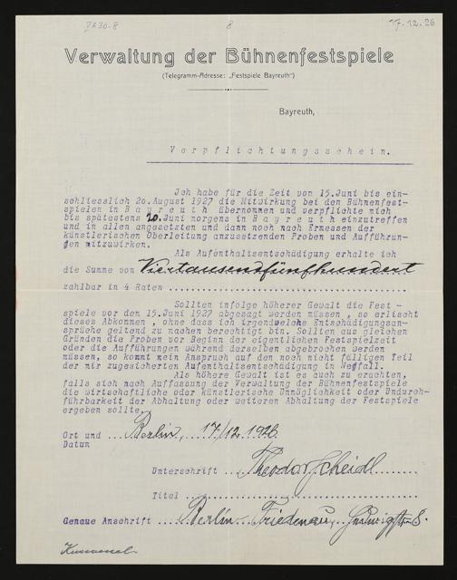 Verpflichtungsschein mit eigenhändigen Eintragungen von Theodor Scheidl an die Verwaltung der Bühnenfestspiele