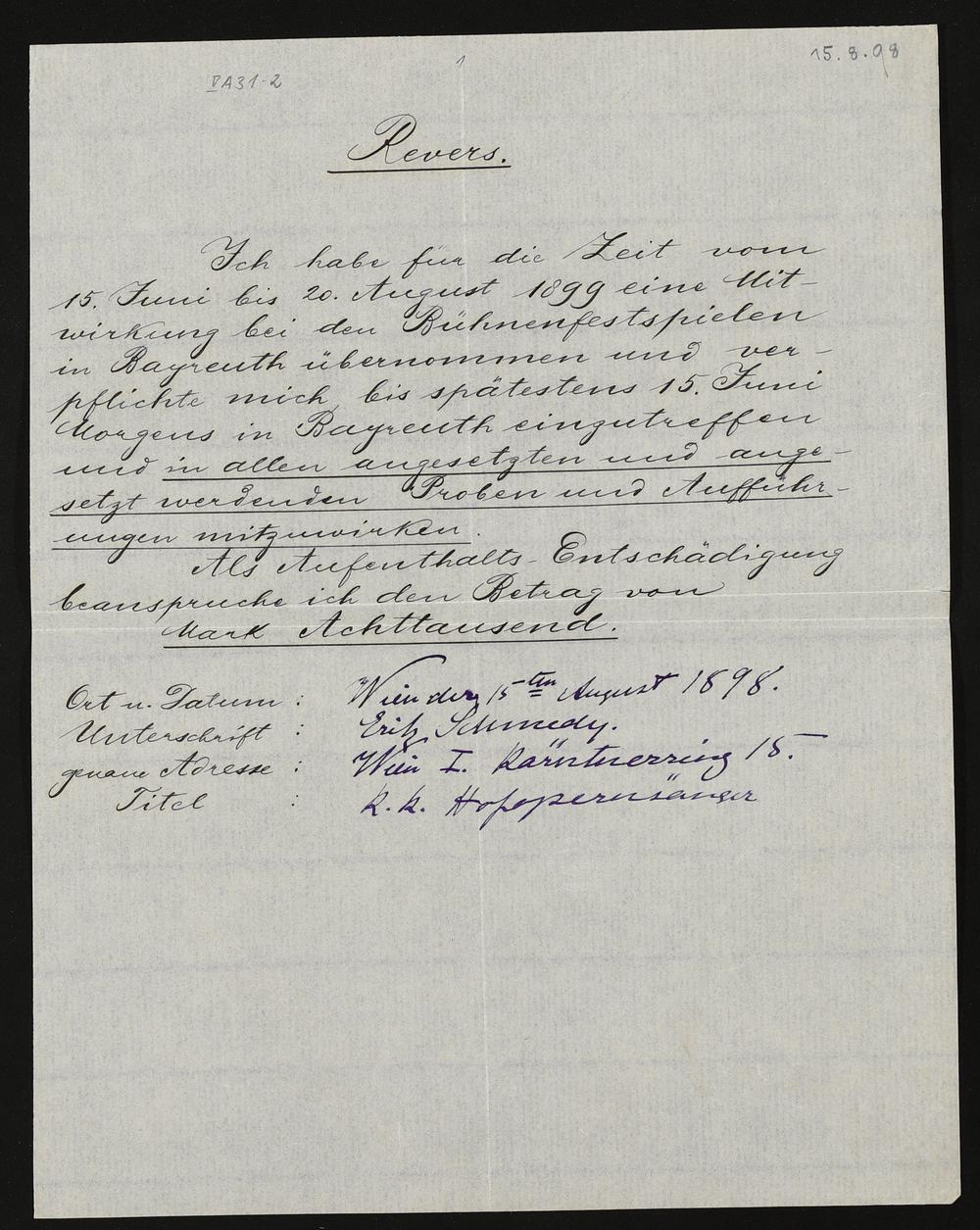 Revers mit eigenhändigen Eintragungen von Erik Schmedes an die Verwaltung der Bühnenfestspiele