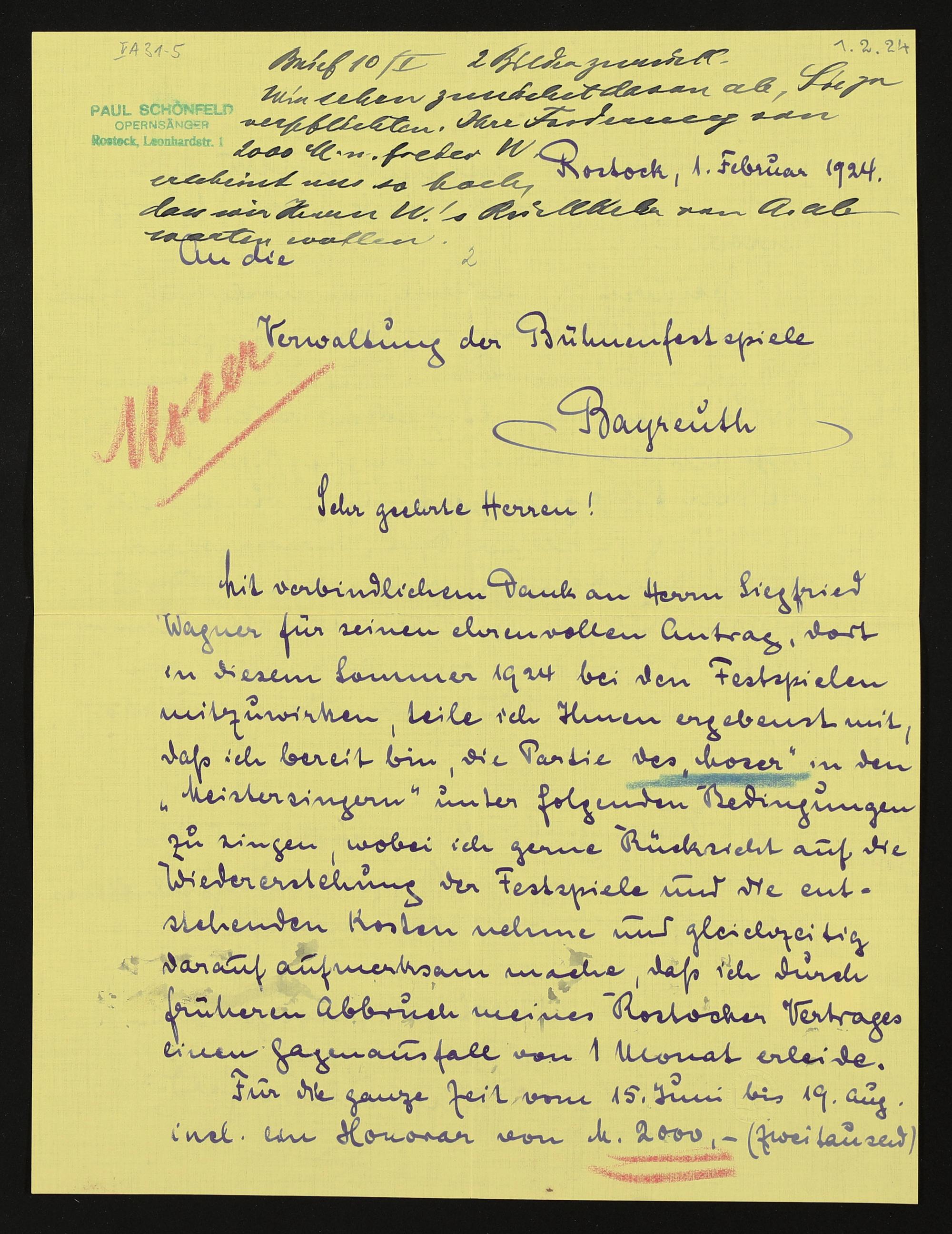 eigenhändiger Brief von Paul Schönfeld an den Verwaltungsrat der Bühnenfestspiele
