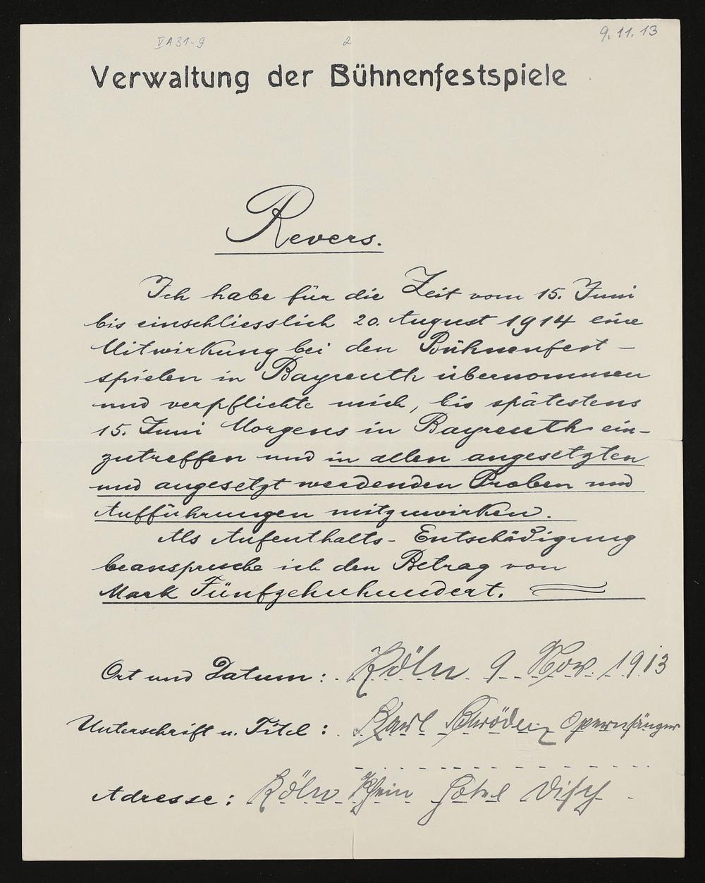 Revers mit eigenhändigen Eintragungen von Karl Schröder an die Verwaltung der Bühnenfestspiele